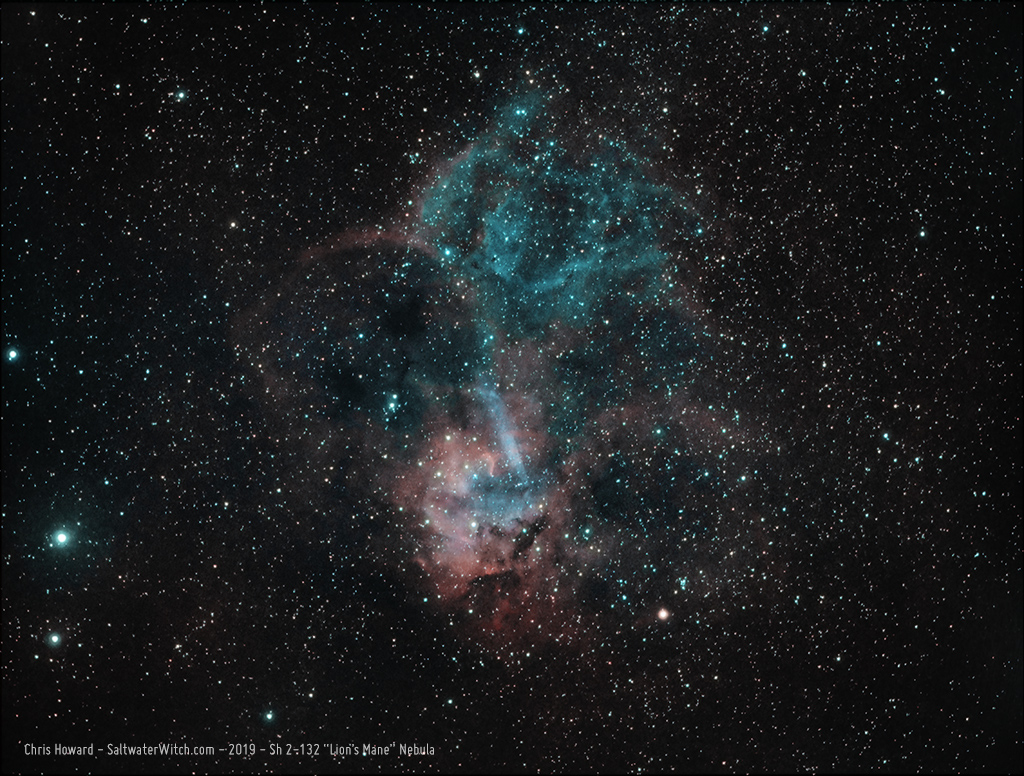 Work-in-progress for Sh 2-132 "Lion's Mane" emission nebula on the border between Cepheus and Lacerta, about 10,000 lightyears away, and over 300 lightyears in diameter. This is why Cepheus is such a wonderful constellation. The Lion's Mane is another giant HII region with ionization partially provided by two Wolf-Rayet stars, WR 152 and WR 153, which have blown out the rings you see in the image. I'm in the middle of capturing data for this. This is a fairly dim object--I only have about half the frames I want for Ha and OIII, and I haven't even started SII capture yet. Here's a bi-color Ha+OIII for the subs I've captured so far. William Optics GT81 APO refractor, ZWO ASI1600MM-Pro mono camera, Astronomik filters, iOptron CEM25P mount.