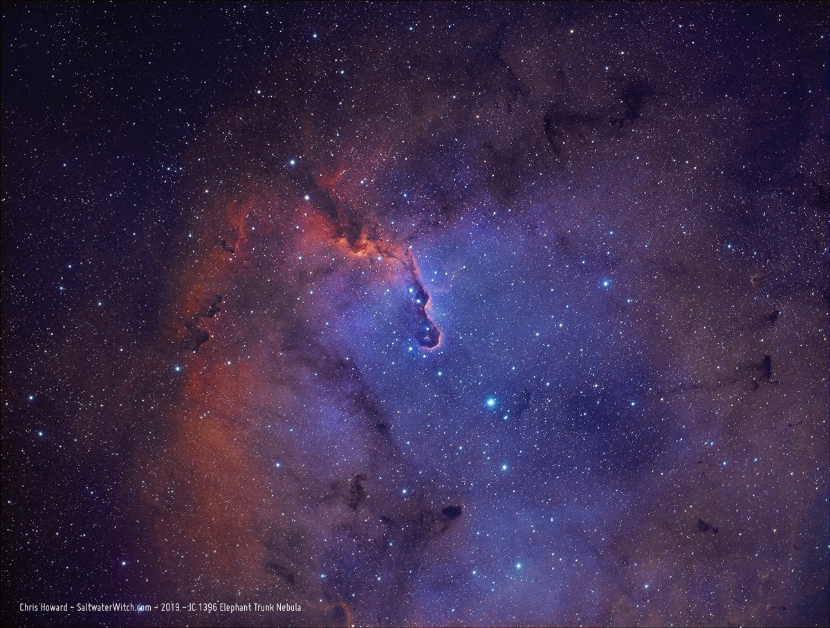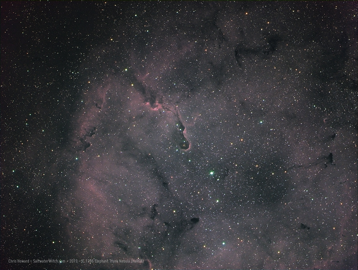 I hung around Cepheus and shot several hours of sub-exposures last night, mostly focused on IC 1396, the "Elephant Trunk Nebula", which is easy to make out near the center of the frame. This giant ionized gas region in Cepheus has some amazing dark bands of dust and other interstellar debris, blocking the light of more distant stars. Like there's that little guy on the right I want to call the "Harry Potter casts an Imperio" nebula. Imaging notes: bi-color made up of 48 stacked subs in Ha and OIII, William Optics GT81 APO refractor, ZWO ASI1600MM-Pro mono camera, Astronomik filters, iOptron CEM25P mount.