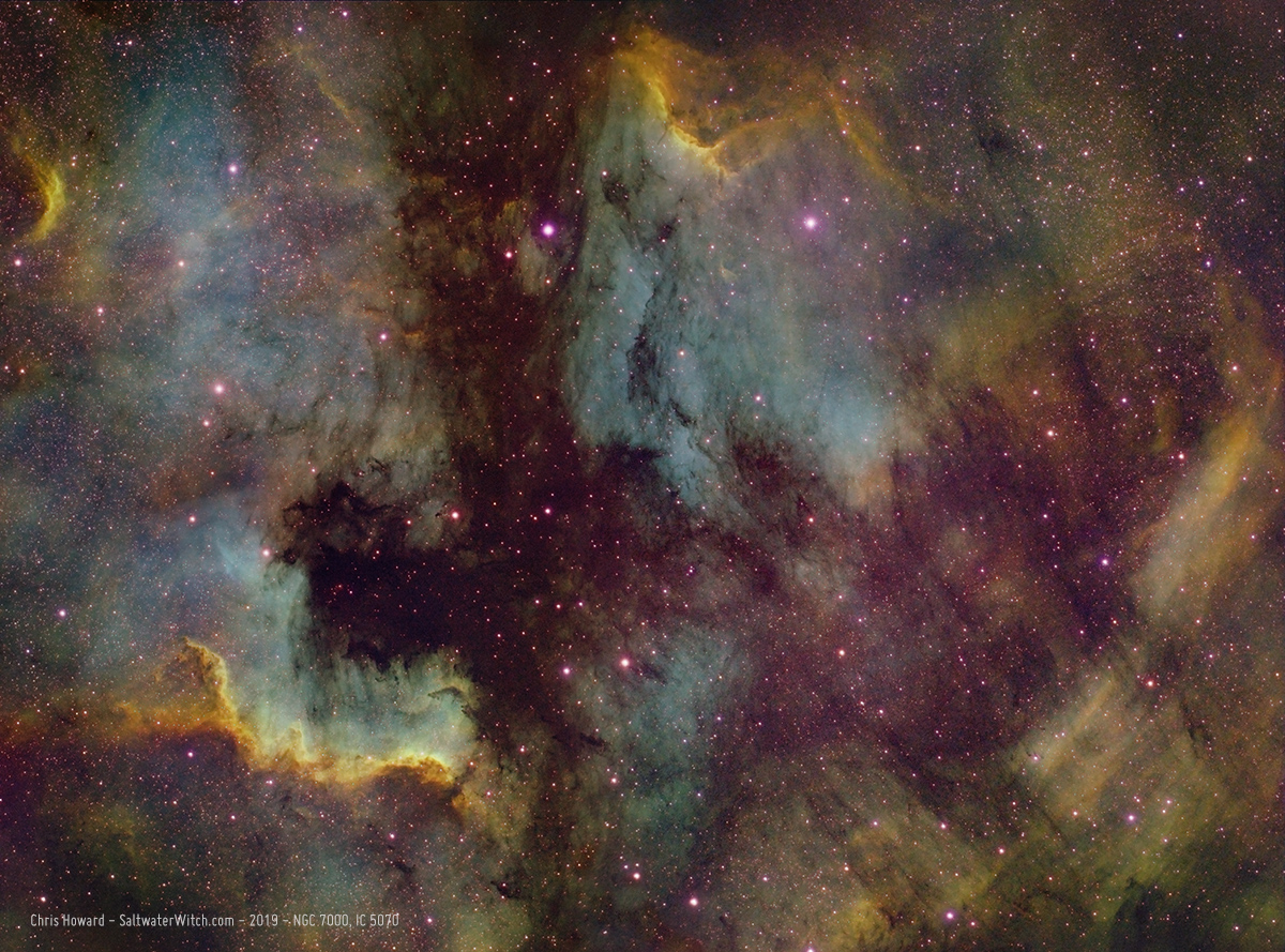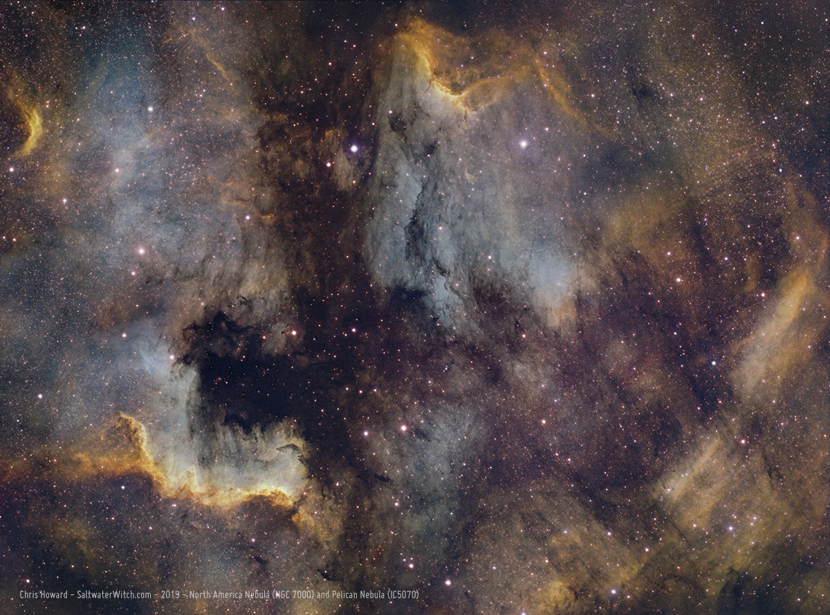 I spent most of last night's imaging run, about 5.5 hours, on this two-panel mosaic of NGC 7000, the North America Nebula and IC 5070, IC 5067 the Pelican Nebula. NGC7000 and this whole area is one of those deep sky objects with which you can do amazing things in narrowband or broadband color, and turns out beautifully in RGB, bi-color Ha and OIII, even Hydrogen-alpha by itself. For this shot I went with the Hubble Palette in SHO, mapping SII-Ha-OIII to RGB, Sulfur = Red, Hydrogen = Green, Oxygen = Blue. This is why you see aqua and gold standing out in many of the Hubble images. It also affects star color, and you end up with some shade of purple.