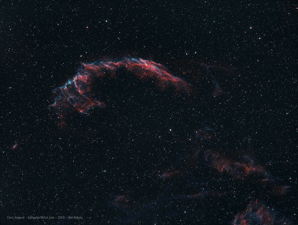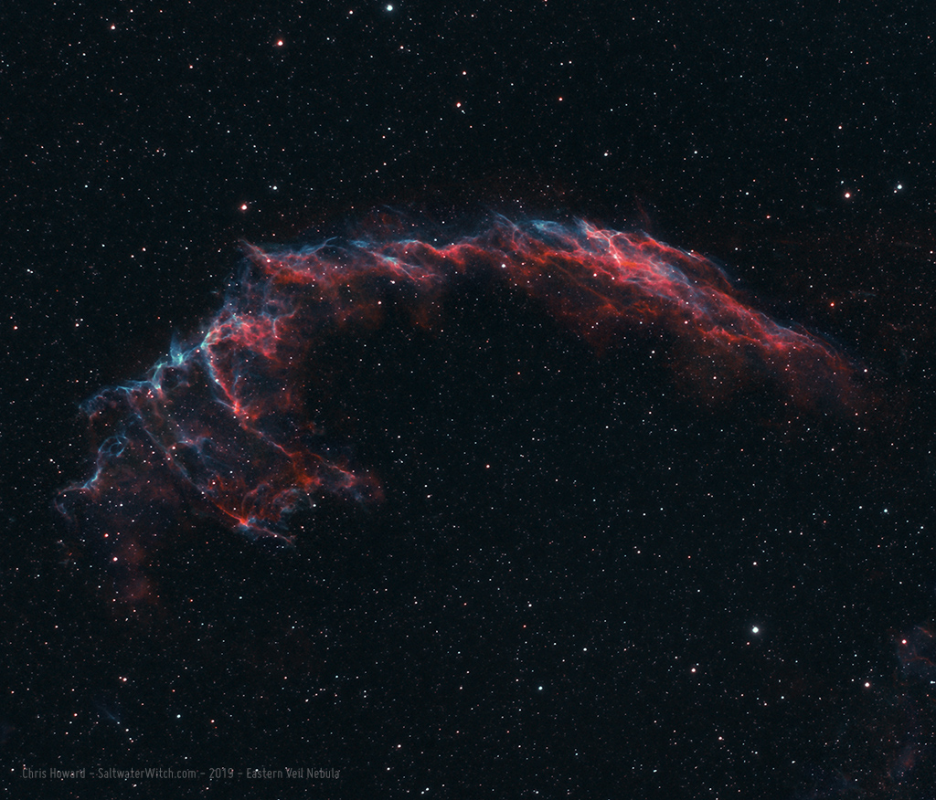 Finally a clear-ish night! I spent almost five hours capturing data, most of it after midnight, when the skies cleared noticeably. And I spent the majority of that time on the Eastern Veil Nebula (Caldwell 33). The big bright area is NGC 6992, and all of this comprises one side (east side) of the Veil Nebula, a supernova remnant from a massive star that ended it all around 8,000 years ago. I will come back on another clear night to get the brighter and larger Western Veil. And this nebula is large, roughly 3 degrees in diameter, covering 36 times the area of a full moon. I shot this in Ha and OIII, 22 x 5 minute exposures for each filter, with the WilliamOptics GT81 and ZWO ASI1600MM-Pro mono camera running at -20C.