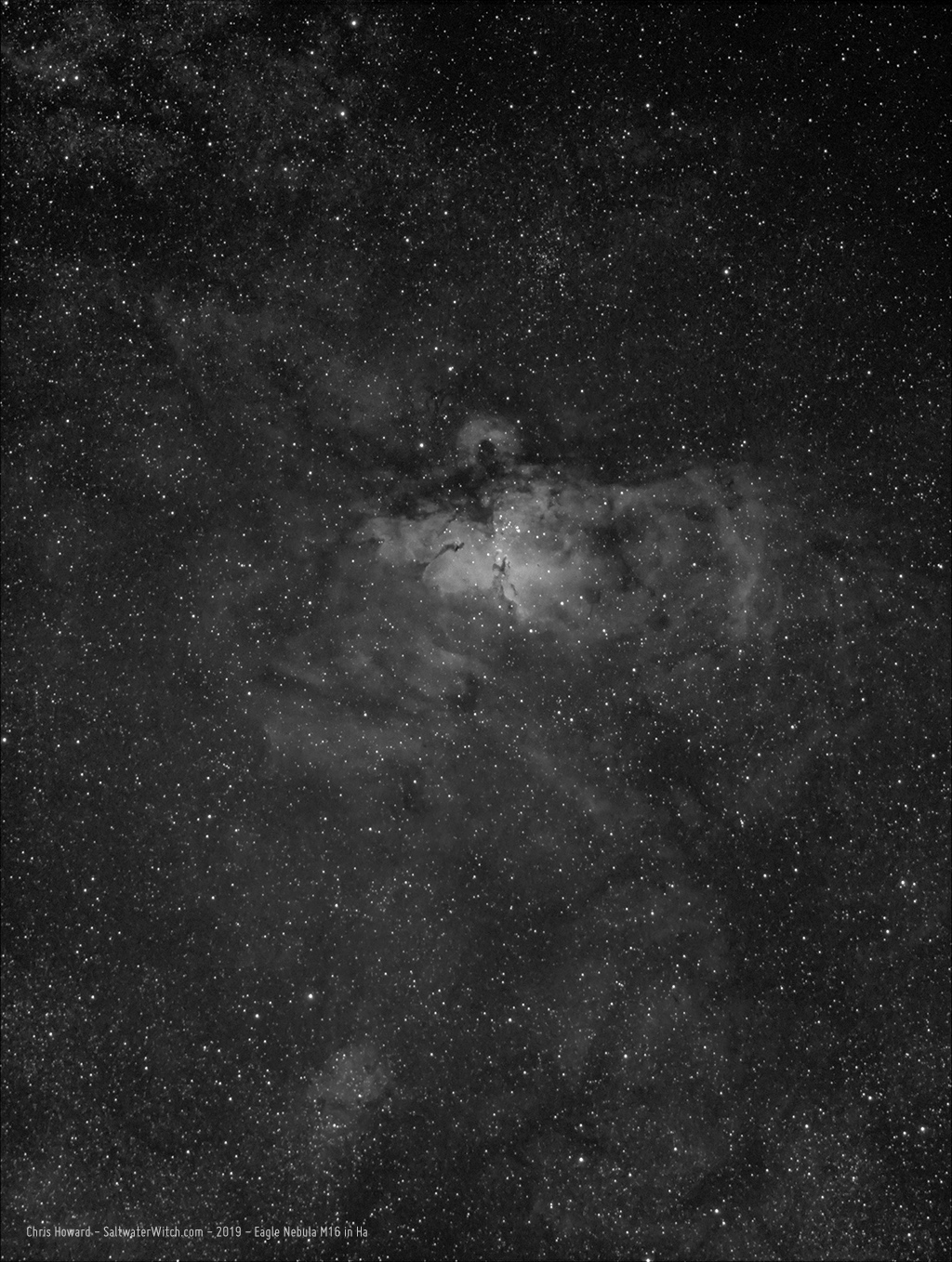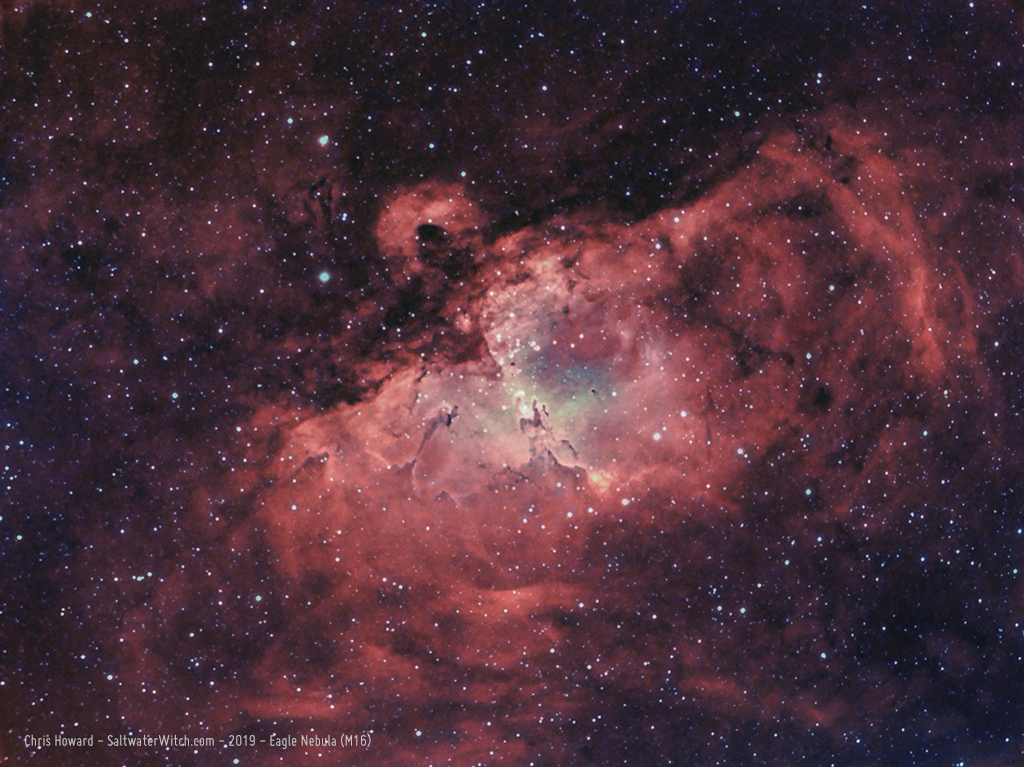 For comparison (with NGC 6611 above), here's the processed version of the Eagle Nebula (M16) I took last year with a slightly different setup--same William Optics scope + Atik414EX mono CCD camera. This is a bi-color hydrogen-alpha and oxygen3. With this one I think I had my OIII frames mapped to G and B channels, and Ha mapped to the Red channel.
