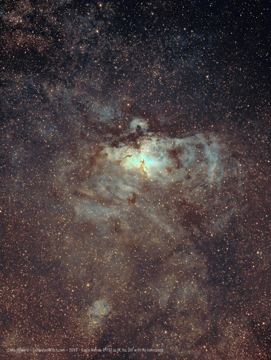 Here's another one from last night's run, a wide-field view of the Eagle Nebula (M16, NGC6611) in IR-OIII-Ha with Ha luminance. From our perspective Messier 16--Eagle Nebula--sits just north of the Milky Way's dense core of stars, bands of clouds, dust, hydrogen, and other galactic detritus. I wasn't very hopeful with the IR subs, but the Ha subs were beautiful. The OIII frames were about what I expected--not too much but enough to include them. To brighten things up I went back and added the processed Ha stack as a luminance layer. Yes, this may be a spectacularly weird color arrangement, but we're working in false color imaging already, and this doesn't seem that far off from our galaxy's actual core colors--at least in terms of the bands of dust and ionized gases.