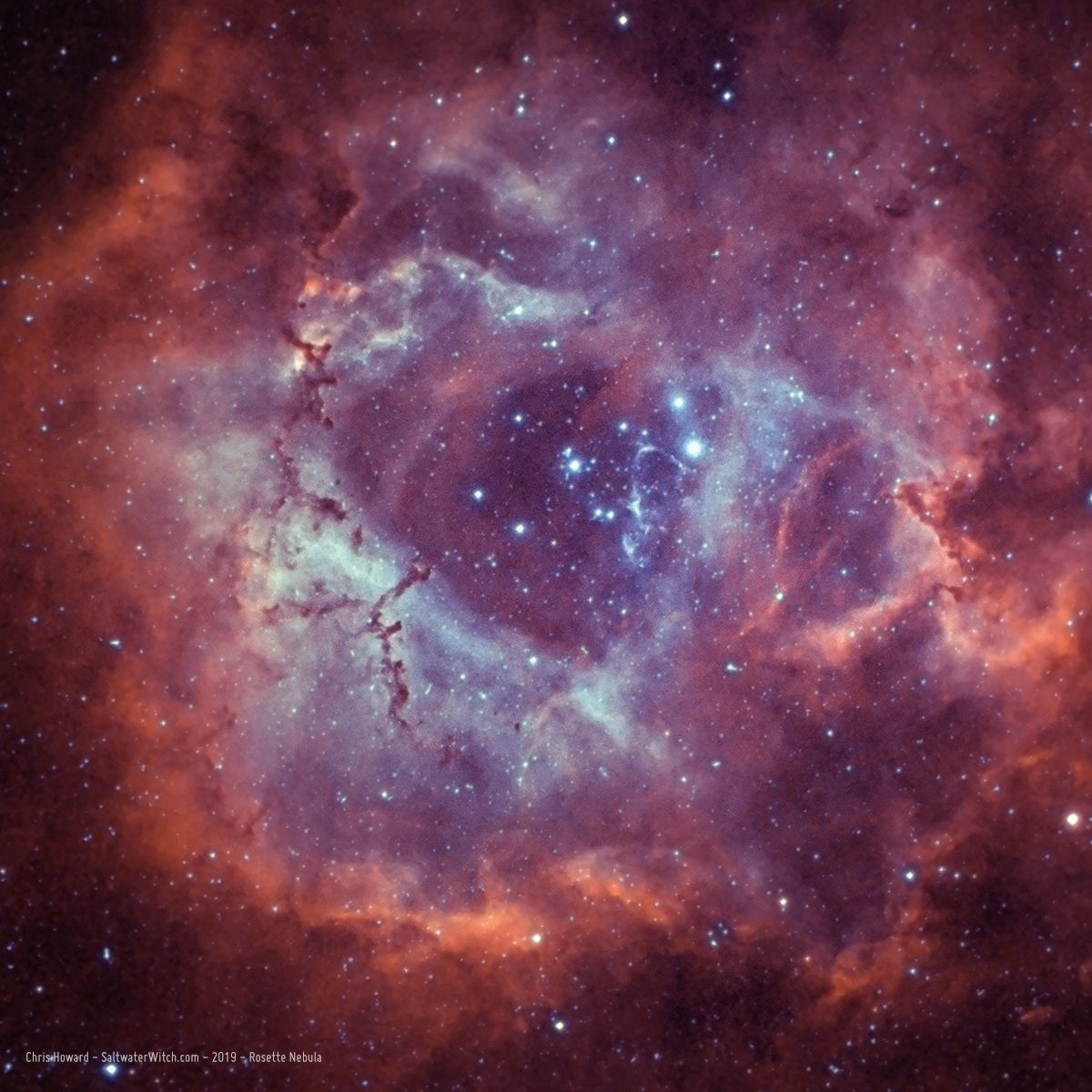 The Rosette Nebula (NGC 2237 et. al.) from my backyard. 28 x 240 secs Ha, 26 x 240 secs OIII. William Optics GT81 APO refractor, ZWO ASI1600MM-Pro mono camera, Astronomik filters, iOptron CEM25P mount, INDI/Ekos/KStars