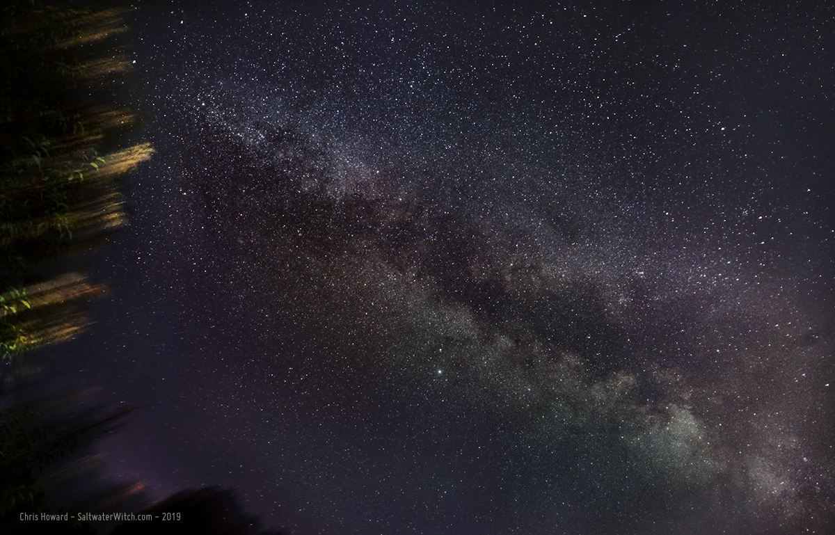 I didn't spend much time on testing last night. The sky was was clear, but seeing was poor. I put the Nikon D750 on the tracker and took a batch of 30 second exposures around 11pm--48 of them, with the tree in the frame. (I cropped some of it out, as well as the edges). Stacked them in DeepSkyStacker and did some processing in PhotoshopCC.