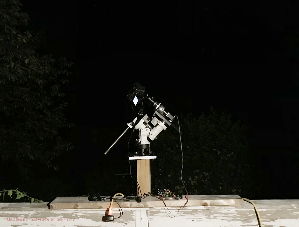 Here's the test in progress, with the Nikon D750 on the tracker and the electronics--arduino and A4988 controller--on the board below, taken with my iPhone.