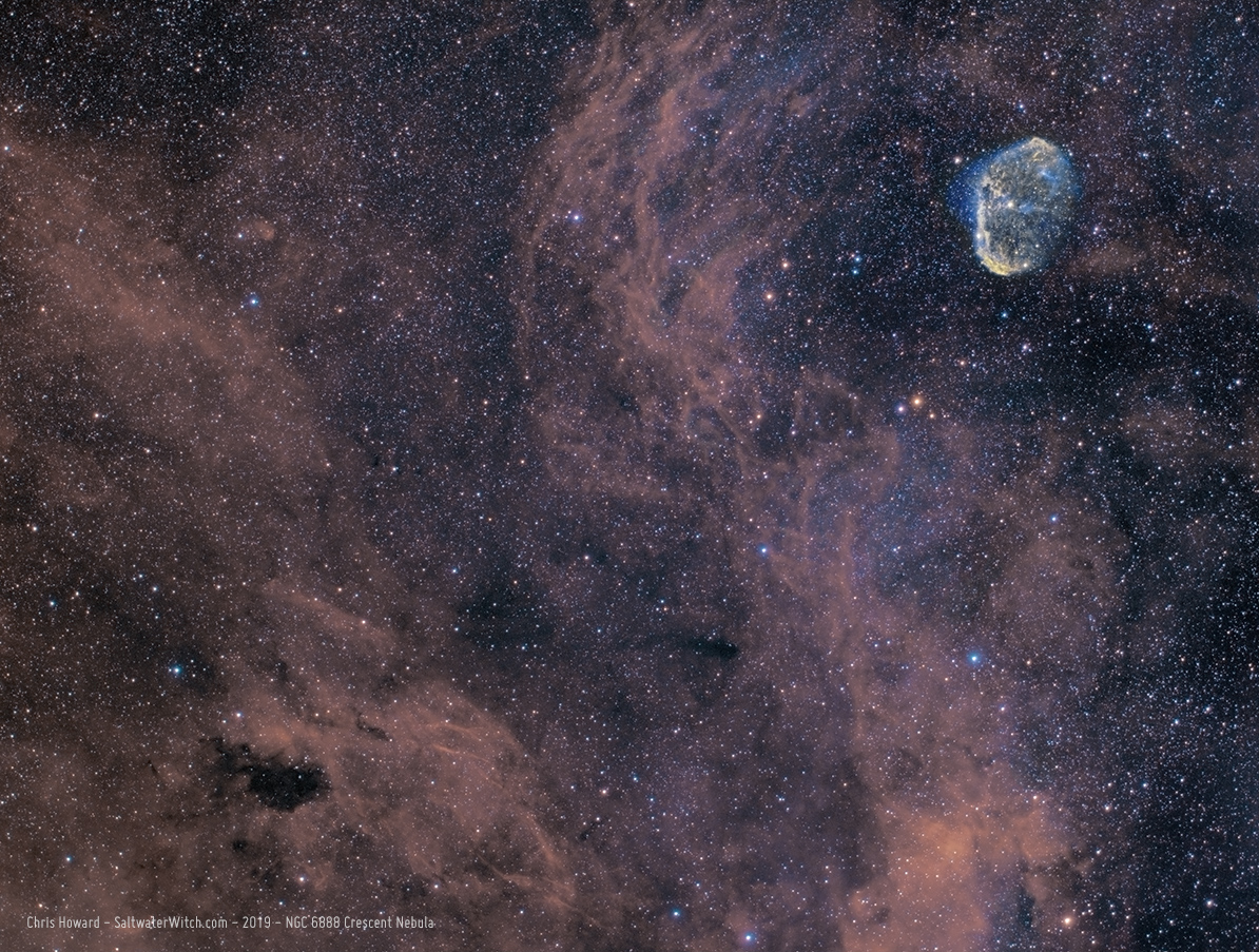 The Crescent Nebula, NGC 6888 (top right) is an emission nebula in the constellation Cygnus, about 5000 light-years away. Like most of this region around Cygnus, you can't do anything in hydrogen-alpha or sulfur2 without wading through clouds of the stuff—billowing, eddying, and general nebulousing. It's beautiful. There's a Wolf-Rayet star, WR 136, at the lower left edge of the Crescent Nebula (from this angle), and it's stirring up violent stellar winds and blazing quickly through its life; it's expected to go supernova in a couple hundred thousand years, and it's only a four or five million years old. WR stars are unusual: they're very bright--thousands of times brighter than our sun, and they burn much hotter, thousands of times hotter than almost all other stars. And they have very short lifespans.