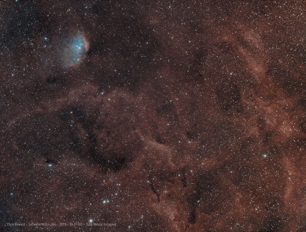 Sharpless 2-101, the Tulip Nebula (top left) is an emission nebula in Cygnus, about 6,000 light-years away. The microquasar Cygnus X-1 is the bright star just above the top point of the Tulip in this image. Cygnus X-1 is famous for being one of the first suspected blackholes, as well as a famous bet between physicists Stephen Hawking and Kip Thorne over that possibility. Hawking conceded to Thorne in 1990 as evidence for a blackhole mounted. Although the Tulip (Sh 2-101) stands out brightly with oxygen in blue, the whole region around the constellation Cygnus is cloudy with interstellar dust and gas. Notes: Astronomik Ha, OIII, and SII filters, William Optics GT81 at f/4.7, ZWO ASI1600MM Pro cooled mono camera, on an iOptron CEM25P mount.