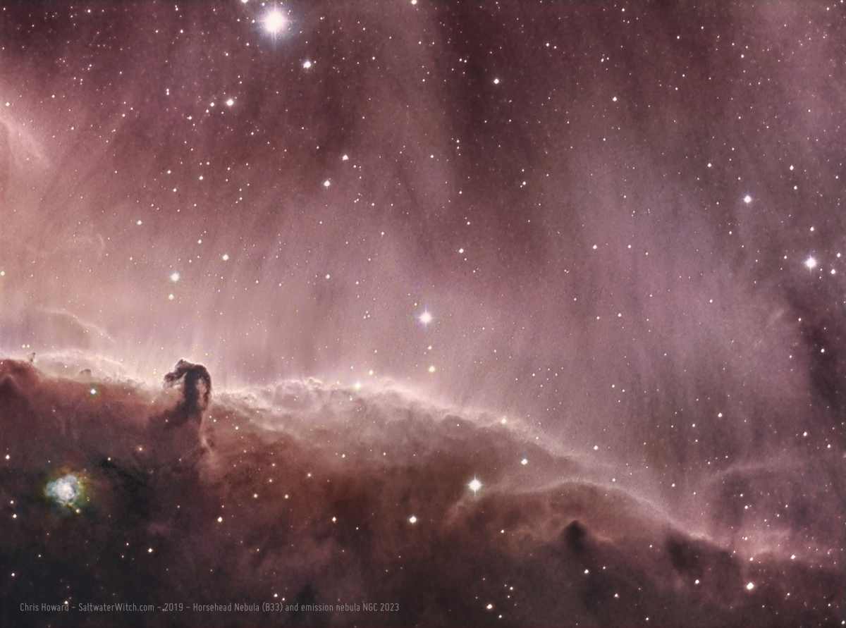 The Horsehead Nebula (B33) and the emission/reflection nebula NGC 2023 (below and left of the Horsehead) in the constellation Orion. With this field of view, you're looking at around 1.7 trillion miles from one side to the other. I captured a batch of narrowband data in Orion last year. Today, I reprocessed some of it, playing with contrast and color balance.