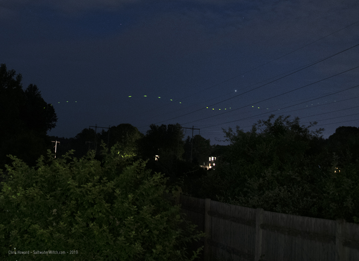 That's Saturn right there low in the sky, right above the path of the fireflies. Even with the clouds, it was a beautiful summer night out there, maybe because the fireflies were adding their bioluminescent fireworks. Here's a 13 second exposure with two of them flying toward each other.