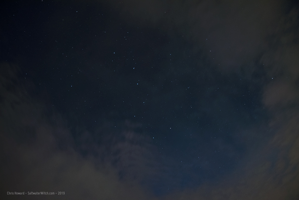 I didn't get a chance to set up the scope last night. As soon as the sun went down it clouded over quickly, so I took the Nikon D750 out and captured a few long exposure shots--in the 8 - 20 second range. I managed to get Ursa Major (Big Dipper) between the clouds. That's Polaris (North Star) on the right. And I wasn't alone out there. The fireflies are out, blinking away.
