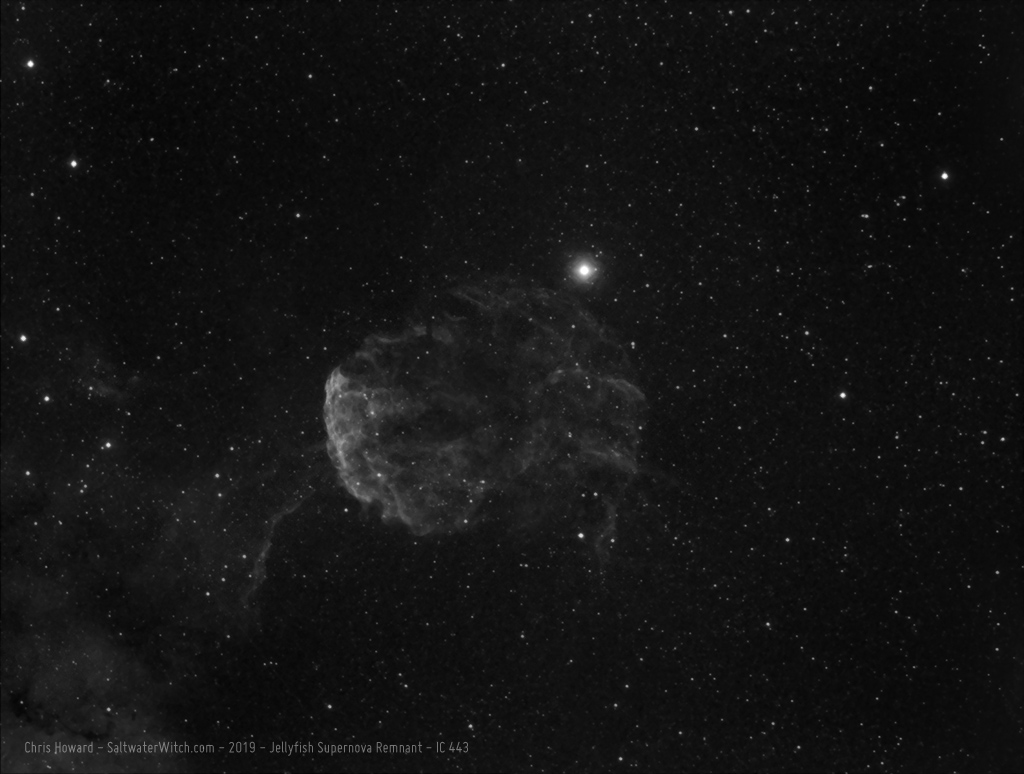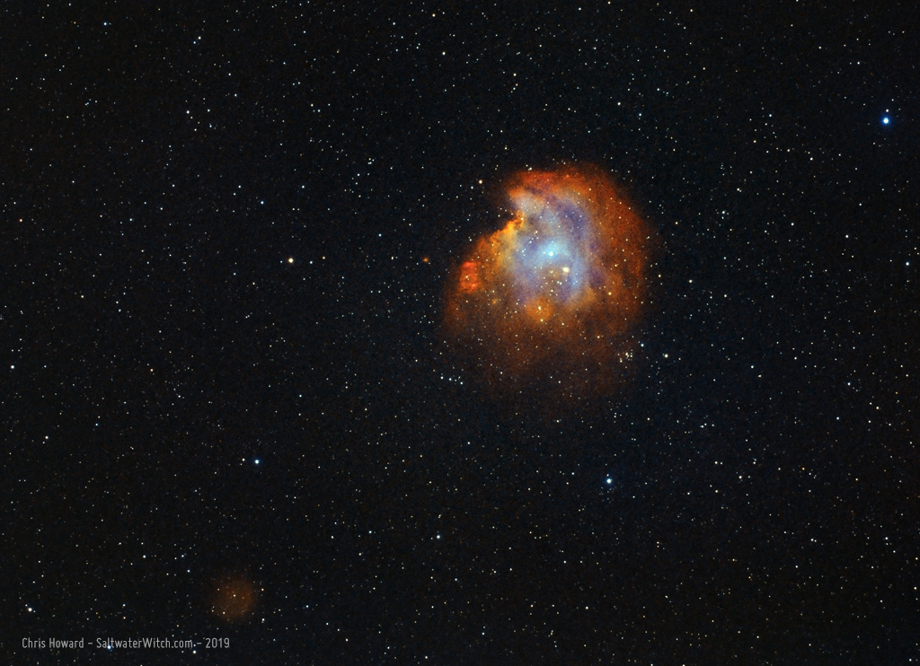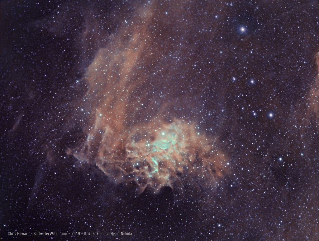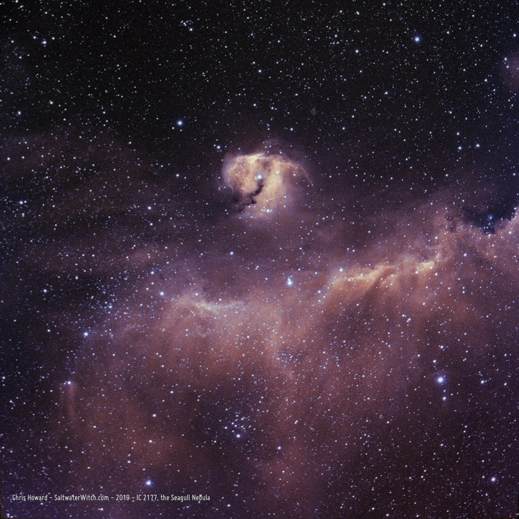 The dust and hydrogen gas of NGC 2327 "Parrot Nebula" and IC 2177 "Seagull Nebula" span 100 lightyears between the constellations Monoceros and Canis Majoris. This is another one from last night (New Years Day). After shooting the Flaming Star Nebula for several hours, I dropped down to IC 2177 for the remaining clear skies (up to around 1am). Neither of these targets are strong--or have anything showing up--in the oxygen bandpass. I ended up cutting the OIII frames and going with bi-color Ha and SII. Exposures: 28 x 300 seconds of Ha, 26 x 360 seconds of SII. Equipment: William Optics GT81 APO refractor, ZWO ASI1600MM-Pro monochrome 16MP camera (unity gain 139/21), Astronomik filters, iOptron CEM25P mount, INDI/Ekos/KStars running in Stellarmate/Raspberry Pi 3b+