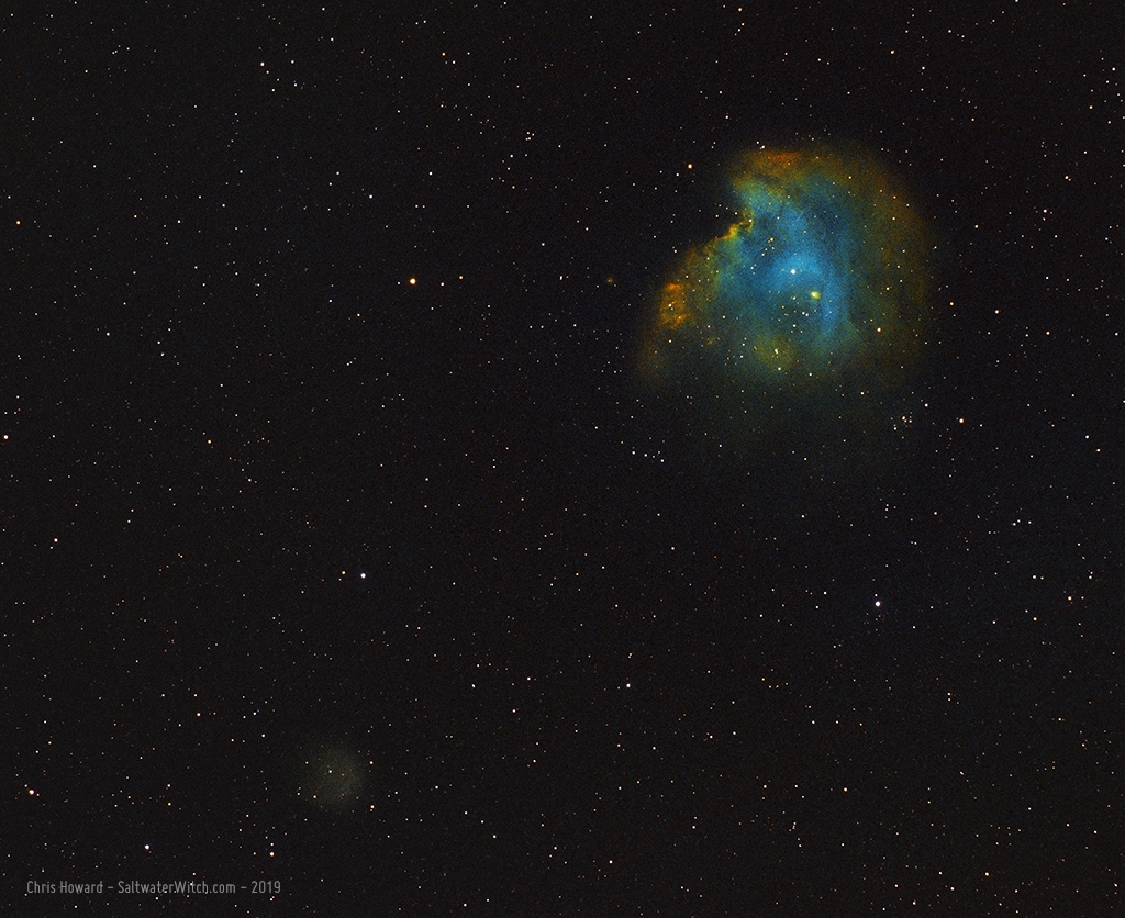 NGC 2174, the Monkey Head Nebula. I went with the Hubble Palette, SHO, on this one. Exposures: 24 x 120 seconds Ha, 26 x 120 seconds OIII, 24 x 120 seconds SII. Equipment: William Optics GT81 APO refractor, ZWO ASI1600MM-Pro monochrome 16MP camera (unity gain 139/21), Astronomik filters, iOptron CEM25P mount, INDI/Ekos/KStars control software. NGC 2174 is a faint emission nebula located in the constellation Orion, about 6400 light-years away. This was a test of my field setup that I'll taking on the road in a week. I'll have to come back to NGC 2174 with longer exposures--and more of them. And dark frames. I didn't shoot any calibration frames in this run.
