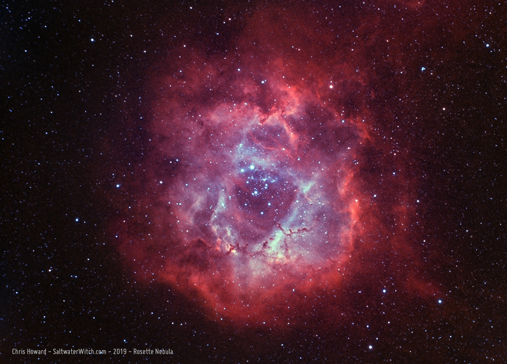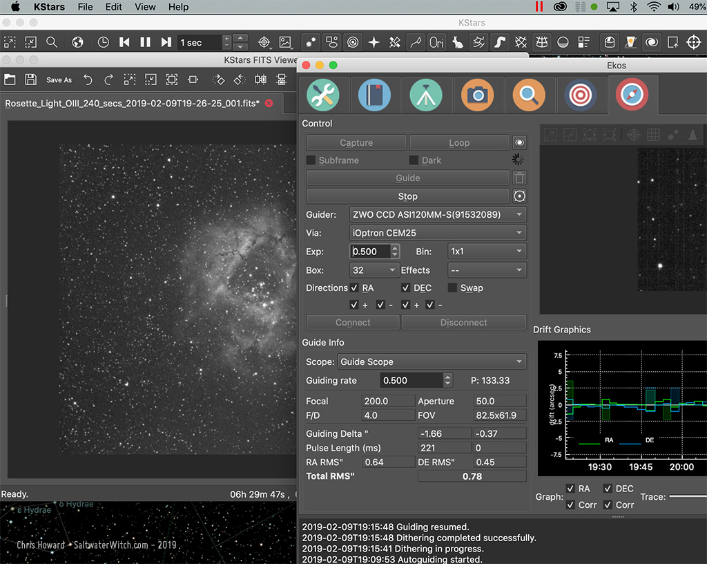 I finished the night of Feb 9th with a small batch of frames to process--really only enough for this bi-color Ha-OIII of the Rosette. I also shot some Ha frames of IC 443, the Jellyfish supernova remnant. Both are looking okay, but I need more data. And the weather doesn't look like it's going to cooperate until the weekend--snow and rain. (I was also playing with the old WO 200mm guide scope with this session, and it went well--Total RMS" in the .60s and .70s most of the time. RMS is the Root Mean Square in arcseconds, the standard deviation of the accumulated star movements over a particular guiding session. Lower is better). Exposures: 28 x 240 seconds of Ha, 26 x 240 seconds of OIII. Equipment: William Optics GT81 APO refractor, ZWO ASI1600MM-Pro monochrome 16MP camera (unity gain 139/21), Astronomik filters, iOptron CEM25P mount, INDI/Ekos/KStars running in Stellarmate/Raspberry Pi 3b+