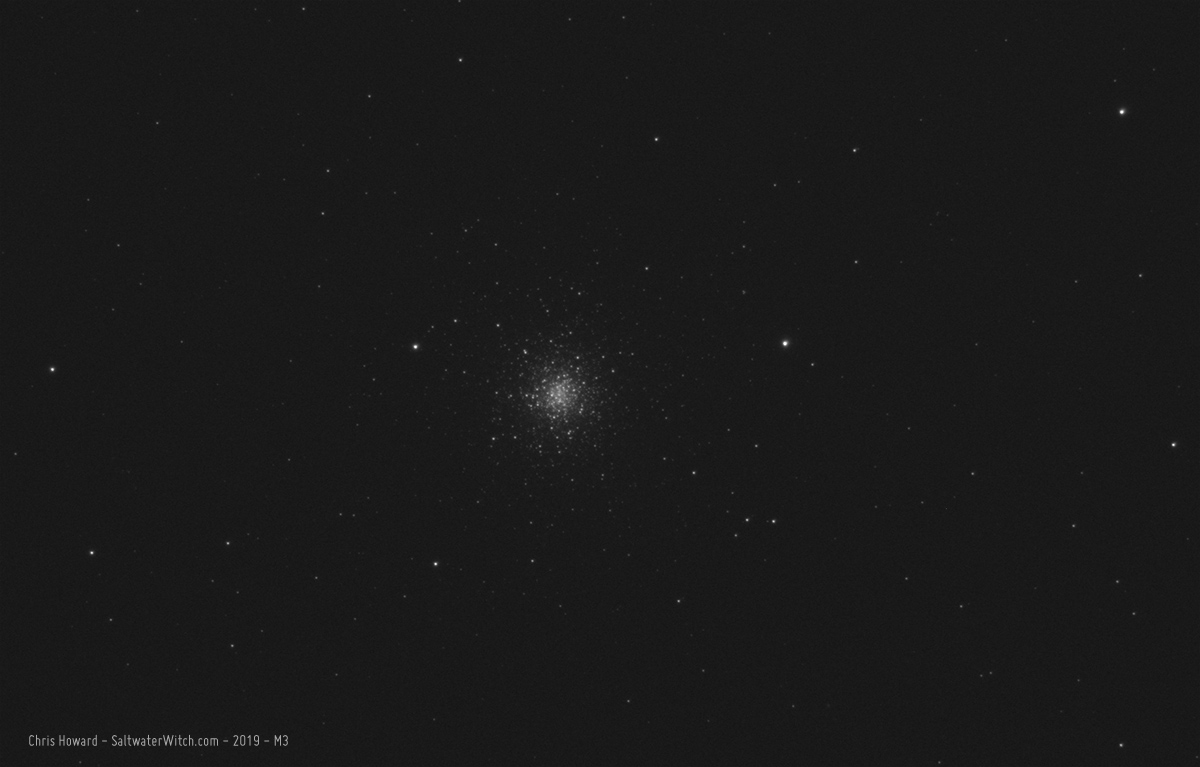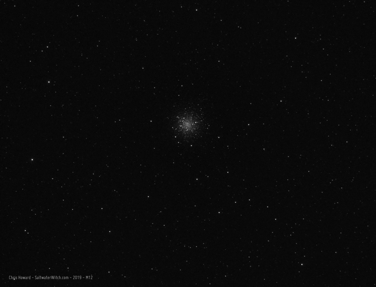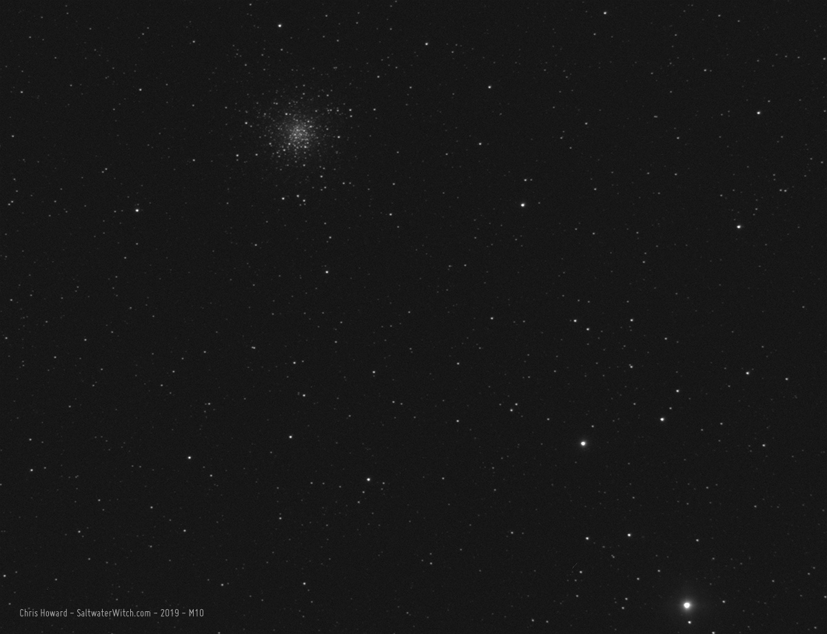 M10 (NGC 6254) is a globular cluster of stars about 14,000 lightyears away in the constellation of Ophiuchus. 4 x 60 second subs in near-Infrared, William Optics GT81, ZWO ASI1600MM-Pro mono, 685nm Near-IR longpass filter. In IR the stars are really distinct in the cluster, and I want to come back with RGB and use the IR frames for luminance, and see how that looks.