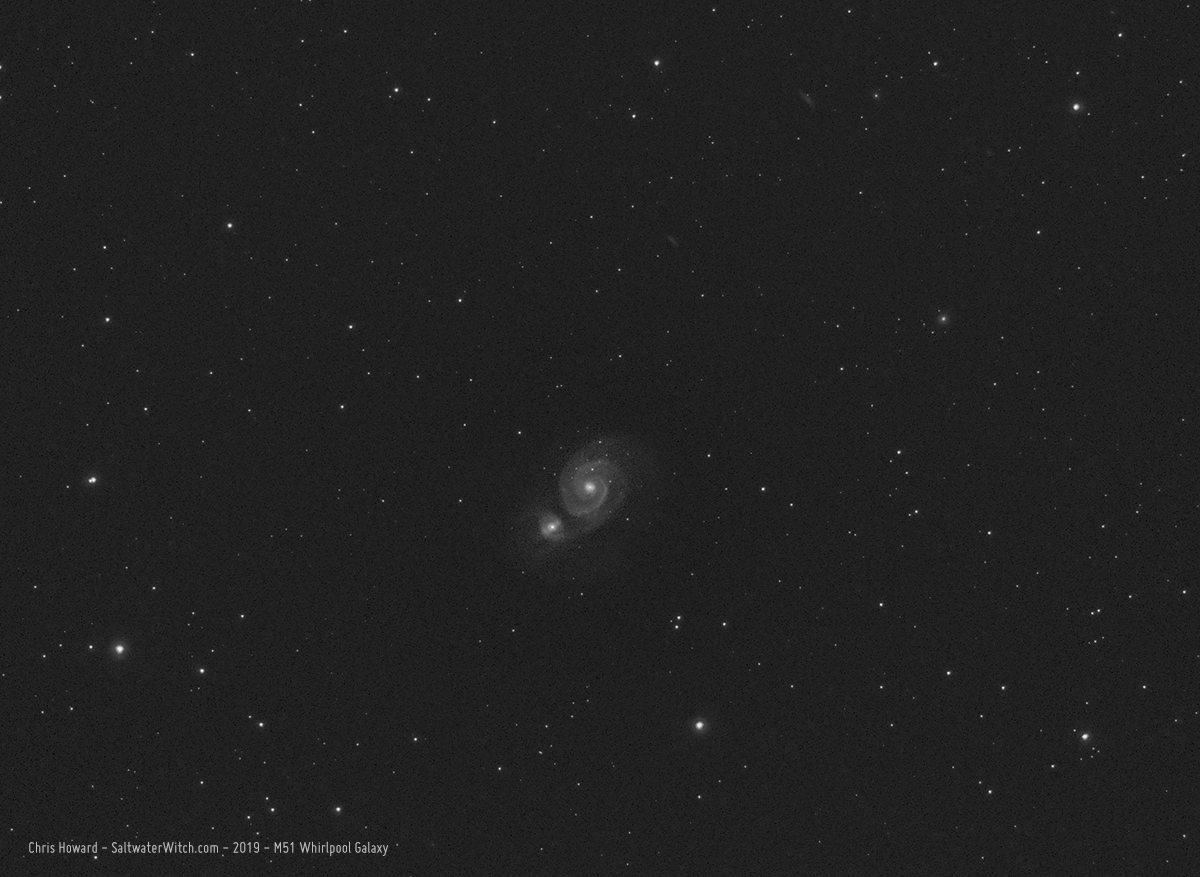 Whirlpool Galaxy (M51) in near-Infrared, WIlliam Optics GT81, ZWO ASI1600MM-Pro mono, 685nm Near-IR longpass filter. M51 is around 23 million lightyears away from us in the constellation Canes Venatici. It’s a tiny view of the galaxies, but I’m impressed with the trailing gas and dust that IR managed to capture.