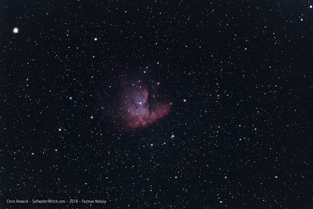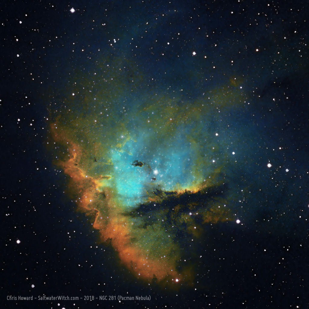 Here's NGC 281 ("Pacman Nebula") in the Hubble Palette (SII, Ha, OIII -> RGB). NGC 281 is an emission nebula, about 9,200 lightyears away in the constellation Cassiopeia. I re-stacked and reprocessed some hydrogen-alpha, oxygen-3, and sulphur-2 image data I shot several months ago, and I'm happier with this latest result than I was then. It's called the Pacman Nebula because it sort of looks like the classic video game character. (6 x 1200 second exposures in Ha, 5 x 1200 sec OIII & SII with 16 dark frames, Atik 414EX mono CCD, Astronomik 12nm Ha, OIII, SII, William Optics GT81, CEM25P EQ mount, WO 50mm guidescope with ZWO ASI120S-MM guide cam, INDI/KStars/Ekos observatory control).