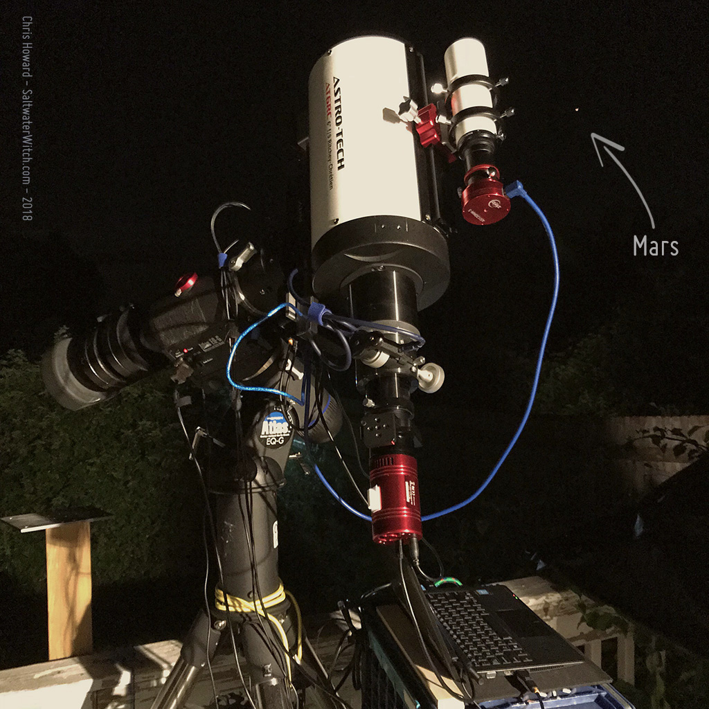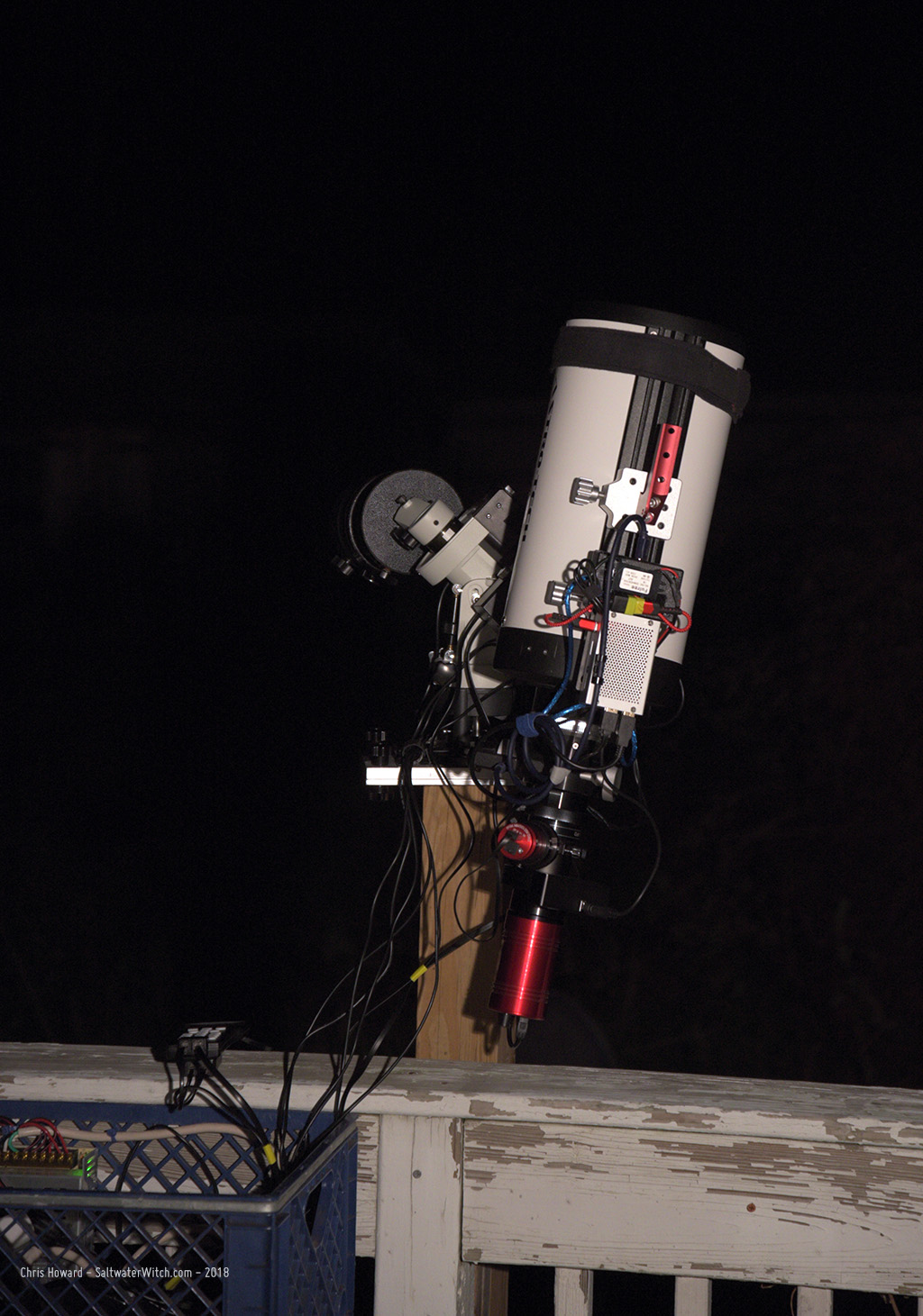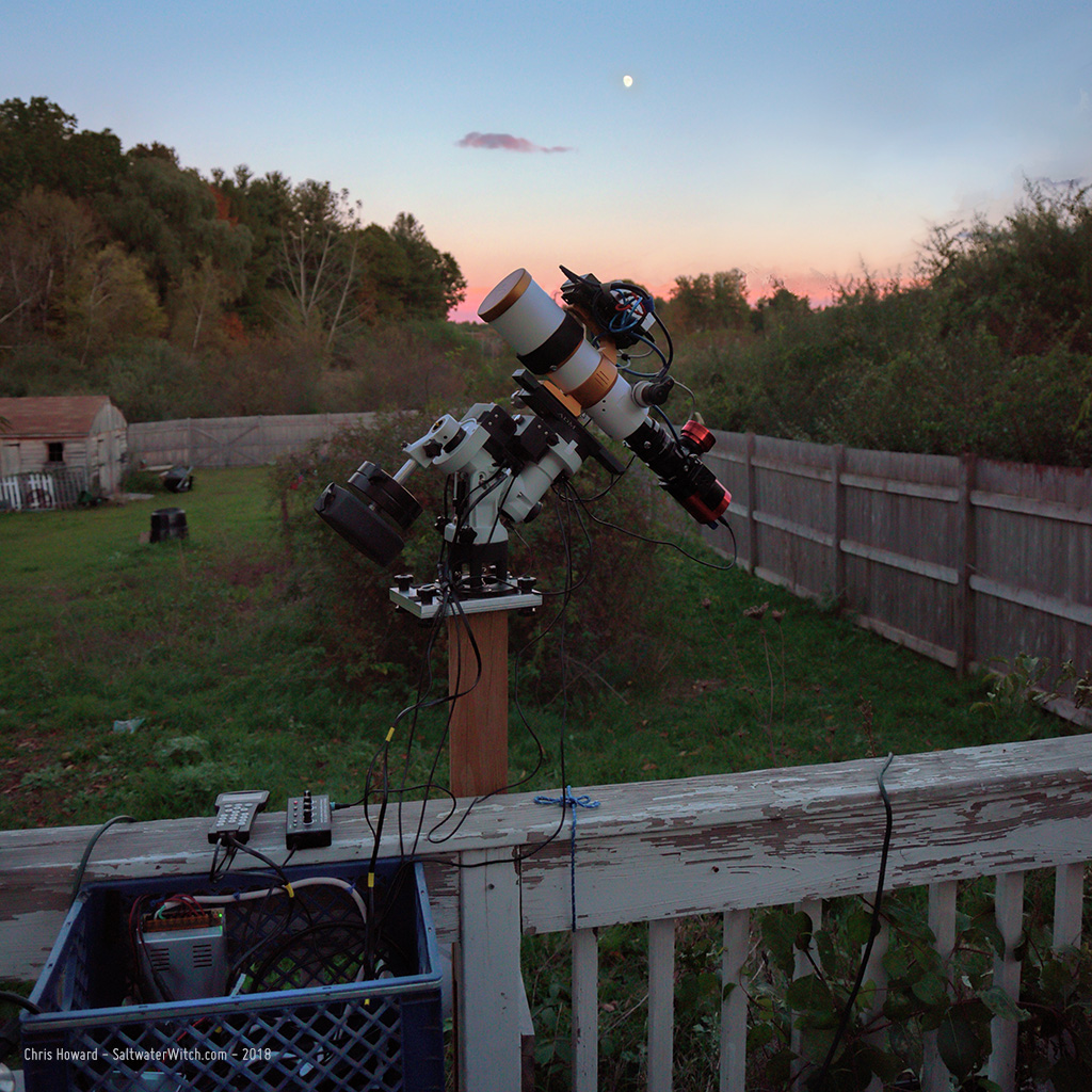 Here are some shots of my set up last night, before nightfall, and in the middle of the narrowband run with 600-second exposures.