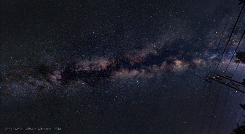 Our galactic neighborhood, looking toward the center, with 13 stacked 15 second exposures, Nikon D750, Rokinon 10mm f/2.8 lens. What's crazy is this is with a decent DSLR camera, lens, a tripod, and some free image stacking software (DSS). I did the stretching in Photoshop CC--"stretching" is when you adjust contrast, intensity values, to bring out the features of whatever you're shooting--in this case the north end of the Milky Way Galaxy, our home. Let me point out some interesting features: starting at the left, that vivid red star is the "Garnet Star" (Mu Cephei), and that's right next to some cool nebulosity that includes the Elephant's Trunk Nebula (IC 1396), a little ways along, you see that blocky reddish region? That's the North America Nebula (NGC 7000) with the star Deneb (19th brightest star in the night sky). Deneb forms the northernmost (leftmost in this shot) point of the famous "Summer Triangle". The other two points are Vega, the 5th brightest star in the night sky (to the right and above the Milky Way core in this shot), and Altair (12th brightest) a little more to the right and below the Milky Way core. Moving along the galaxy to that bright region on the bottom side of the core, about halfway between Altair and the powerlines--if you really zoom in, you'll see the Wild Duck Cluster (M11). Now look just left of where the powerlines cross, those grayish-pink cloudy areas? That's where you will find the Eagle Nebula (Messier 16, NGC 6611) and the Swan Nebula (M17). That bright point of light in the middle of the powerlines is the planet Saturn, which is moving along the ecliptic and right now it's in a pretty good place for viewing. Just right of that are a few more cloudy areas. That's where you would look for the Lagoon Nebula (M8, NGC 6523) and Trifid Nebula (M20, NGC 6514). Somewhere along the Milky Way--this is where you will mostly likely find me focusing my telescope all the through the summer and fall. I almost see this shot as a map of places to visit from afar, and the cool thing is you really don't need to setup the astro gear for this. You can create your own galaxy map, as long as your camera can handle long exposures (not that long, only 15 seconds) and you have it on a tripod with a remote shutter control. And this is only part of the sky from where I'm standing on our little planet! Another way to put this image in perspective is here in the northern hemisphere, around 43° latitude, I don't have enough of a view south (blocked by hills and trees) to see Sagittarius A*, which marks the center of our galaxy, and this far north there's a sky full of other galaxies, a large section of our own galaxy, nebulae, and other deep space objects that I can't ever see from here--that I would have to travel below the equator to see. Some day!