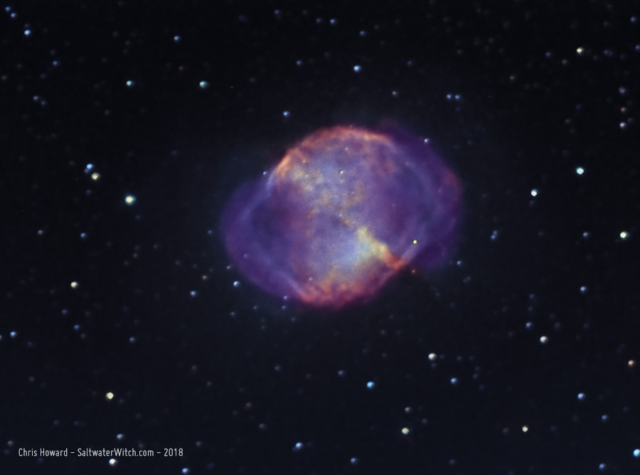 The Dumbbell Nebula (M27, NGC 6853), also called the Apple Core, is a planetary nebula in the constellation Vulpecula. I setup the AstroTech with 1350mm focal length, paired with the Atik 414EX mono CCD. This gives me .98" / pixel resolution and oversampling, but still managed to get some detail out of the nebula. (Imaging info: 63 x 90 second subs in OIII, 96 x 60 sec. subs of Ha. + 20 dark frames stacked in Nebulosity, processing in PSCC2018. Equipment: AstroTech AT6RC f/9 Ritchey-Chrétien, Atik 414EX mono CCD, 7nm Optolong 2" Ha filter, 8.5nm Baader 2" OIII filter, Orion Atlas EQ-G Mount, ZWO ASI120MM-S Guide Cam + WO 50/200mm guide scope)