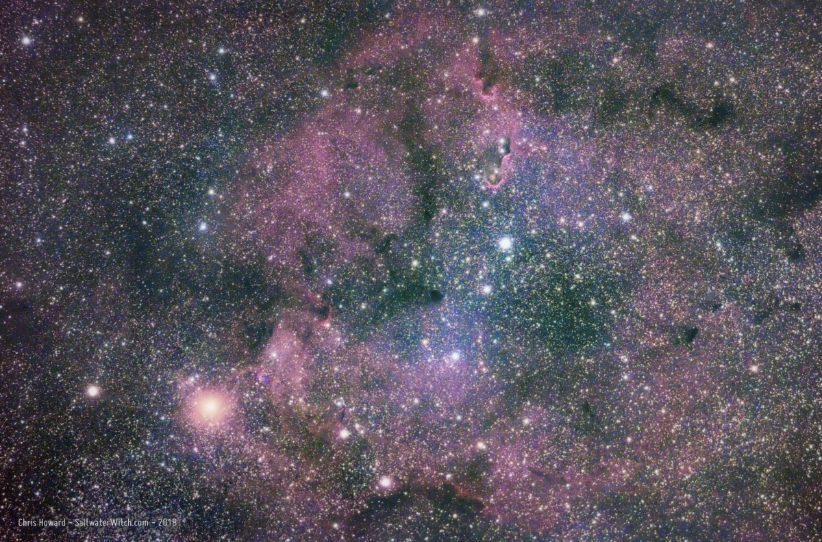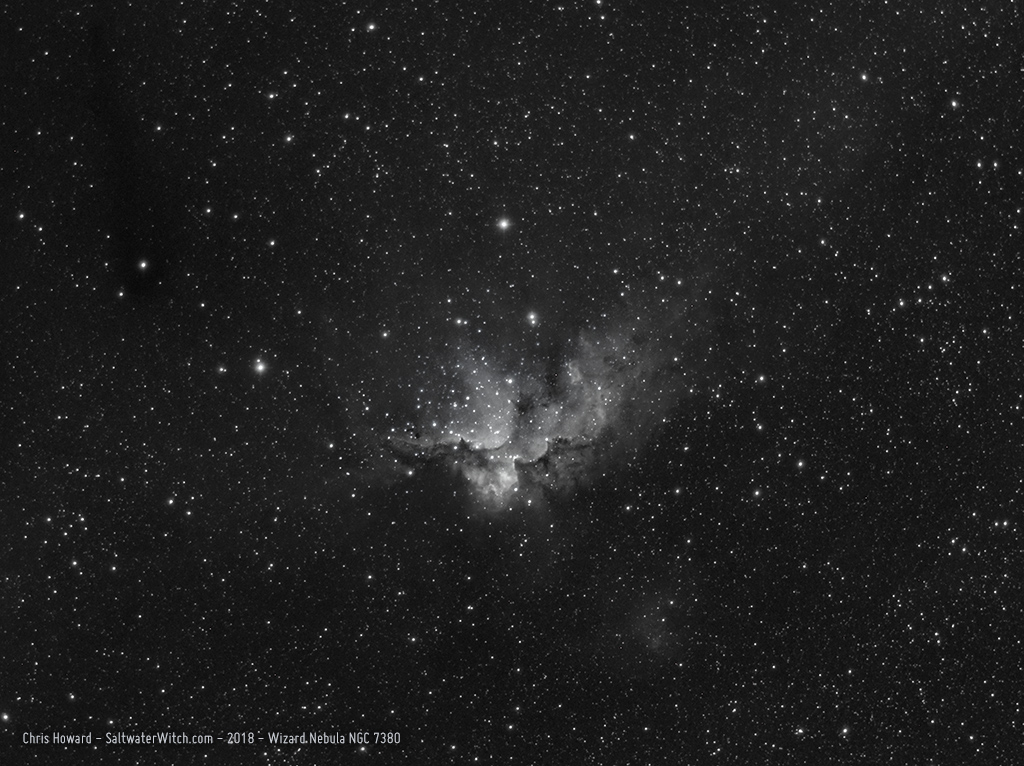 Wide-field of the Wizard Nebula surrounding the open star cluster NGC 7380 in the constellation Cepheus, about 7,200 lightyears aways from us. I reduced the saturation so that you hardly notice the differences in the RGB mix, mostly R and B because this is a bi-color set with Ha and OIII. I think I prefer this reduced color or even a completely desaturated (grayscale) version. There are so many stars in this image and I'm not a fan of the off-color red and blue stars you get with narrowband. Also in this shot, I particular like the dark band at the top left. These "dark fog" or dark nebula regions consist of interstellar gas and dust that absorb the light from surrounding stars, and the constellation Cepheus has some famous dark cloudy areas, B 174, 150, and several around IC 1396. (16 x 300 second exposures in Ha and OIII, Atik 414EX mono CCD, Astronomik 12nm Ha, OIII filters, William Optics ZS61 + WO Flat F6A f/4.7, CEM25P EQ mount, Orion OAG + ZWO ASI120MM-Mini guide cam, Stellarmate OS (INDI/KStars/Ekos) running on Raspberry Pi 3b+).