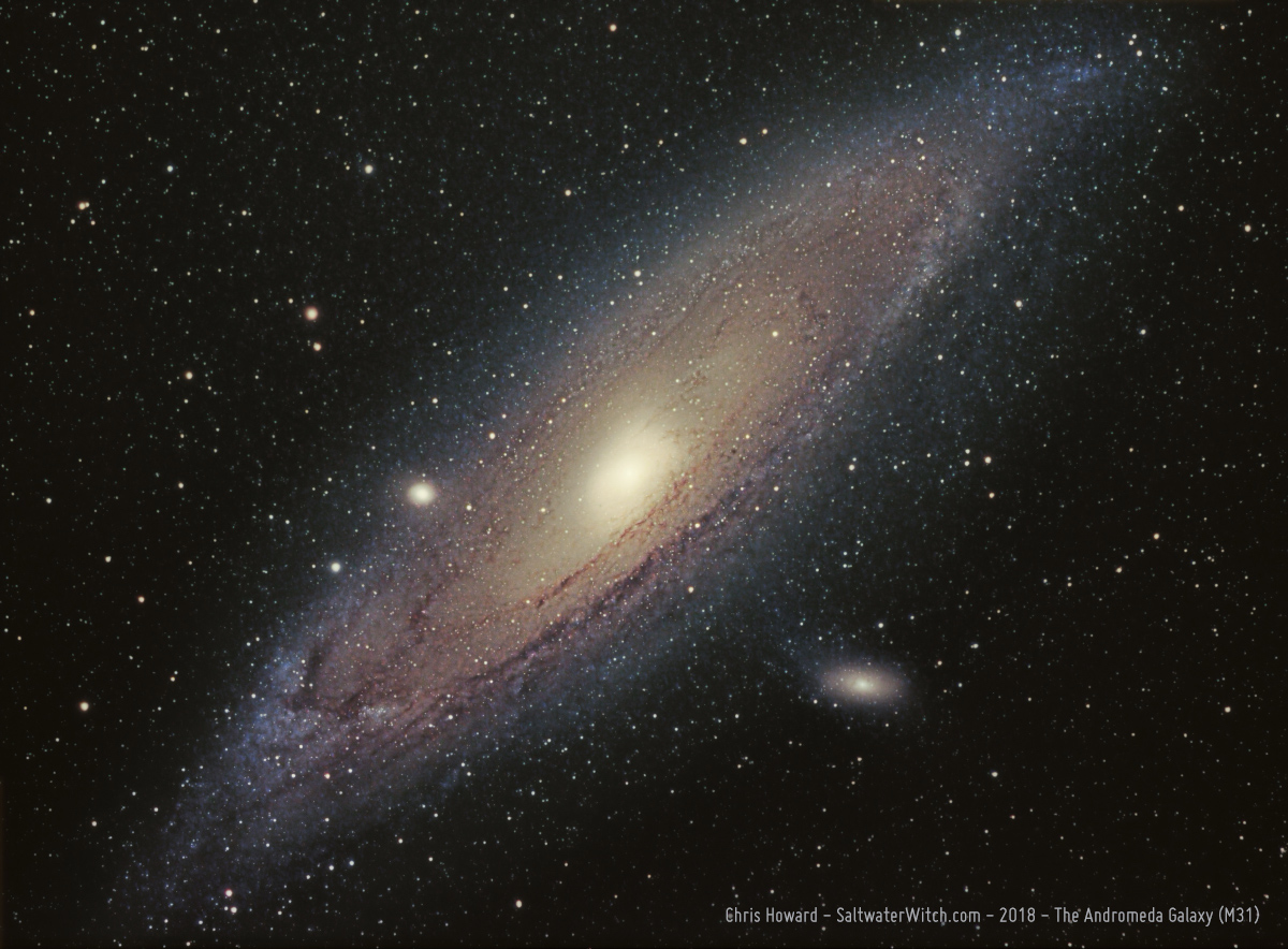The Andromeda Galaxy. The last time I photographed Andromeda (M31) was 2015, maybe fall of 2014? It's been a while. I was using a DSLR--that was the only camera I had, and I had it on a terribly-used Celestron CG-5 equatorial mount with some aftermarket RA/DEC motors. By "terribly-used" I mean you could drive a truck through the gear backlash. Even so, I still managed to get some decent 30-second exposures of Andromeda, Orion Nebula, and other big bright targets in the sky. Well, I'm back with our galactic neighbor, and with much better gear: 192 x 120-second sub-exposures stacked in DSS, processed in PSCC2018, ZWO ASI071MC camera at -10C, William Optics GT81 APO, iOptron CEM25P EQ mount.