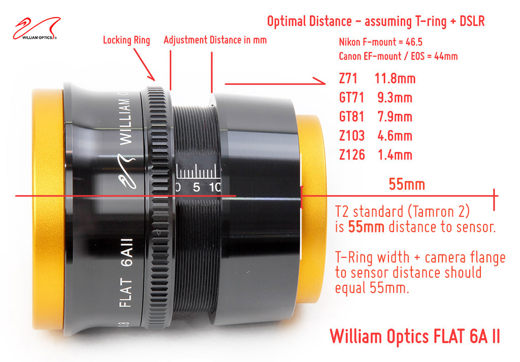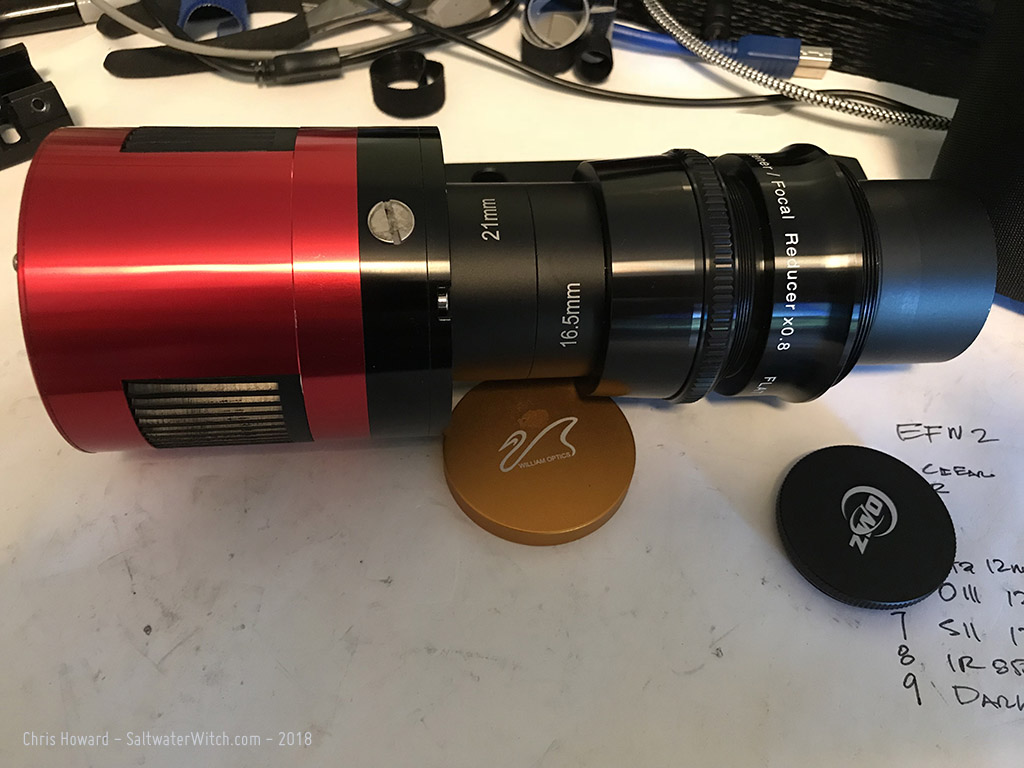 I recently bought the William Optics FLAT 6A II, and finally made it out under the stars to take some sub-exposures. I paired it with my GT-81 and ZWO ASI071MC color CMOS camera. The FLAT 6A II is a 0.8x reducer/field flattener; it's adjustable for different focal lengths, and so far, with my limited use, it appears to be quite a leap over the old William Optics F6-A I've used for a few years. The ASI071 has an APS-C sized sensor, and anyone with a large sensor astro camera or DSLR knows if you don't want field curvature with your refractor you need some sort of flattener. The FLAT6AII design makes it easy to dial in the correct distance for the scope you're using. The old reducer/flattener worked, but I had to test out a dozen different flattener to sensor distances, and still had to do some cropping and processing to fix the corners. This new FLAT 6AII provides a fairly flat field across the entire view. Equipment: William Optics GT-81 + FLAT 6A II 0.8x reducer f/4.7, ZWO ASI071MC-Cool color CMOS camera - gain 0 offset 8, ZWO ASI120MM-S Guide Cam + 130mm guide scope.
