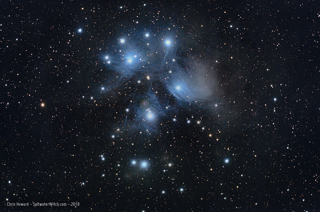 The Pleiades, M45, also known as "The Seven Sisters" and in Japanese as Subaru (昴). It's one of the most identifiable objects in the night sky, but it's more than just a loose group of stars. Located in the constellation Taurus, the Pleiades is a nearby open star cluster mostly made up of a batch of relatively young B-type stars amid (or behind) a reflection nebula that appears to surround and fill the space between the stars with veil-like sheets and threads. (WilliamOptics GT81, ZWO ASI071MC: 60 x 60 second and 60 x 120 second exposures, unity gain).