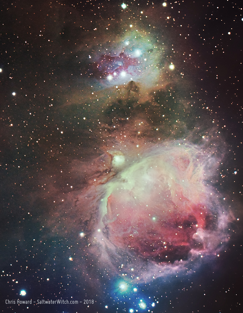 Part of the Orion Molecular Cloud Complex that surrounds the blue supergiant Alnitak (large star in the center), including the Flame Nebula (NGC 2024), IC 434, Horsehead Nebula (Barnard 33), NGC 2023, IC 431, and more. About 1500 lightyears from earth. (22 x 300 sec frames, 24 dark frames). William Optics GT81 APO refractor, ZWO ASI071MC-C camera, iOptron CEM25P EQ mount. In case you're wondering, I'm pretty damned excited about this camera (ZWO ASI071MC), just going off what it can capture in faint nebulosity, and what I can bring out without much effort by stretching 22 stacked frames. I can't wait to see what I can capture in the summer when the big galaxies like Andromeda and Triangulum swing through.