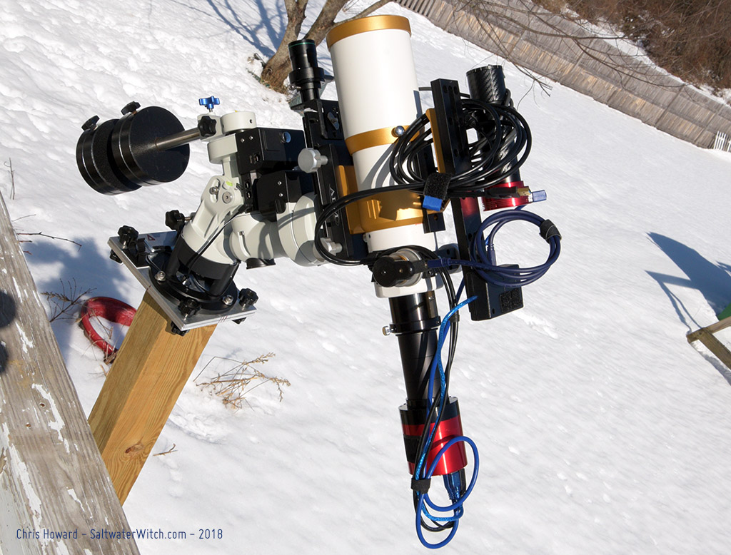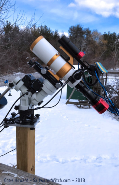 Here's my setup for last night's astro session, with the William Optics GT81 APO refractor, ZWO ASI071MC-C primary camera, iOptron CEM25P EQ mount.