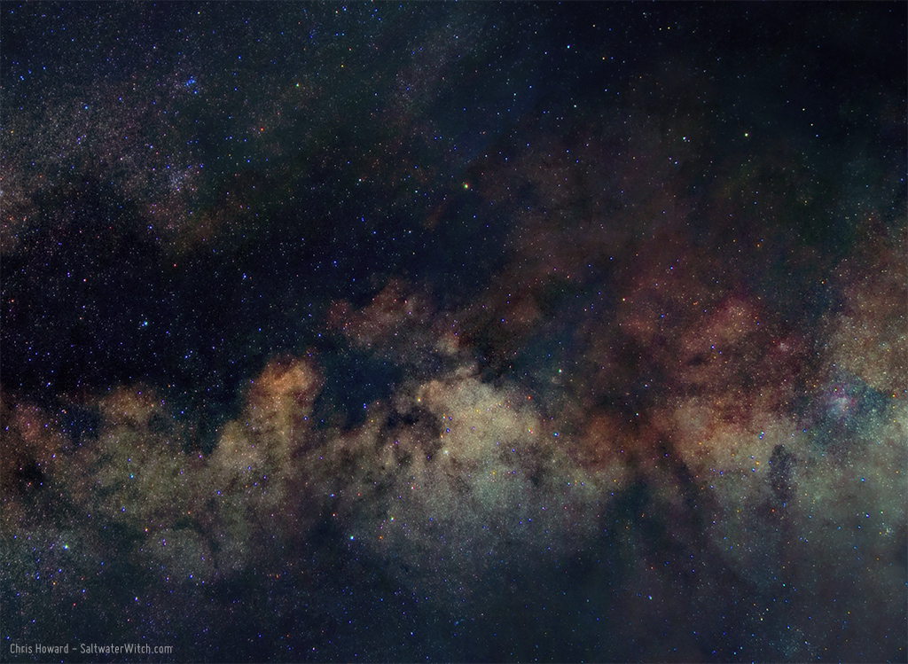 The above shot covers a 30 × 20° FOV of the Milky Way from a little below M17 (Swan Nebula) in the constellation Sagittarius to a little past Delta Aquilae, the bright white star at the bottom left, in the constellation Aquila. Below, is my original shot cropped from M17 on the right to just past Eta Cygni, a variable double star in the constellation Cygnus--about twice the width of the one above. The brightest star in the frame, low center, is Altair.