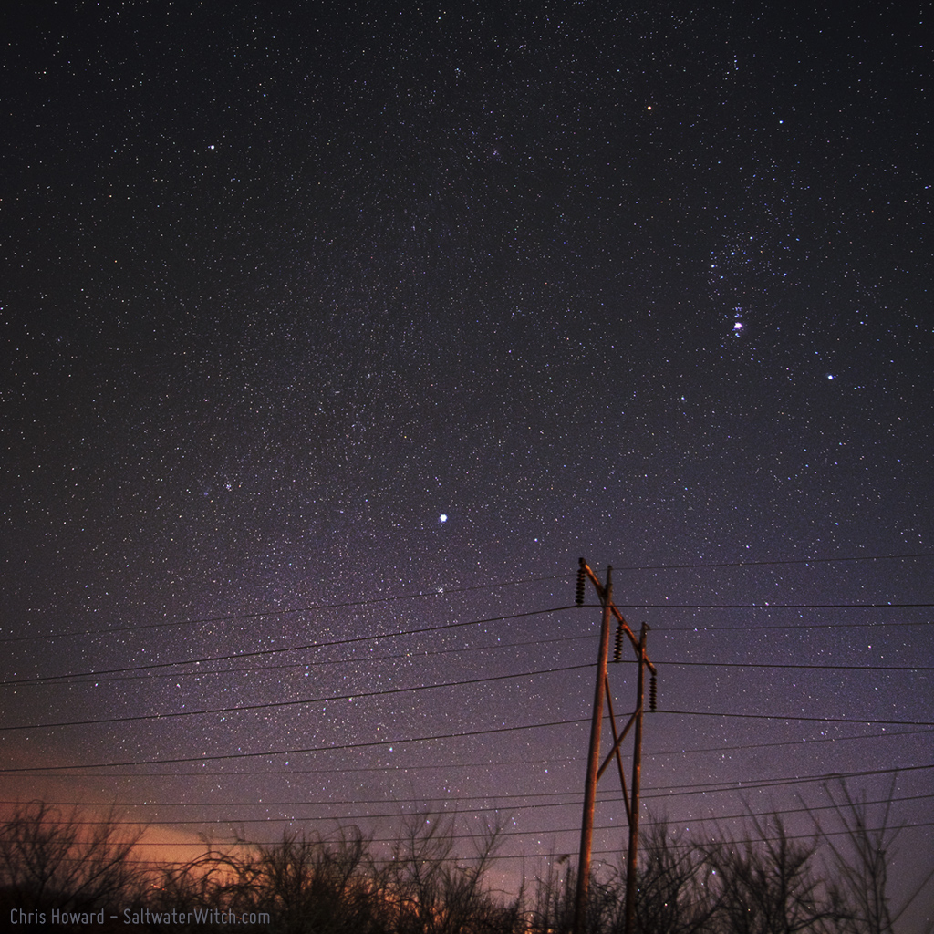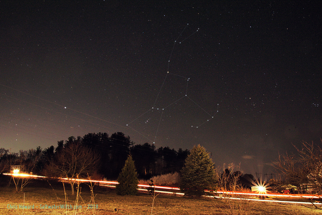 As the days become longer, as we swing around our sun, headed for aphelion in July (greatest distance from the sun), and our planet's 23.5 degree tilt is angled toward its rays, we'll be seeing less of the constellation Orion--in normal viewing hours. I took this 30 second exposure last night around 9PM, and Orion is already moving below the trees to the southwest. That's the Pleiades (M45) at the far right. I also happened to capture the headlights and brakelights of Alice's car as she's driving past to our driveway, almost home after picking up Christopher from work.