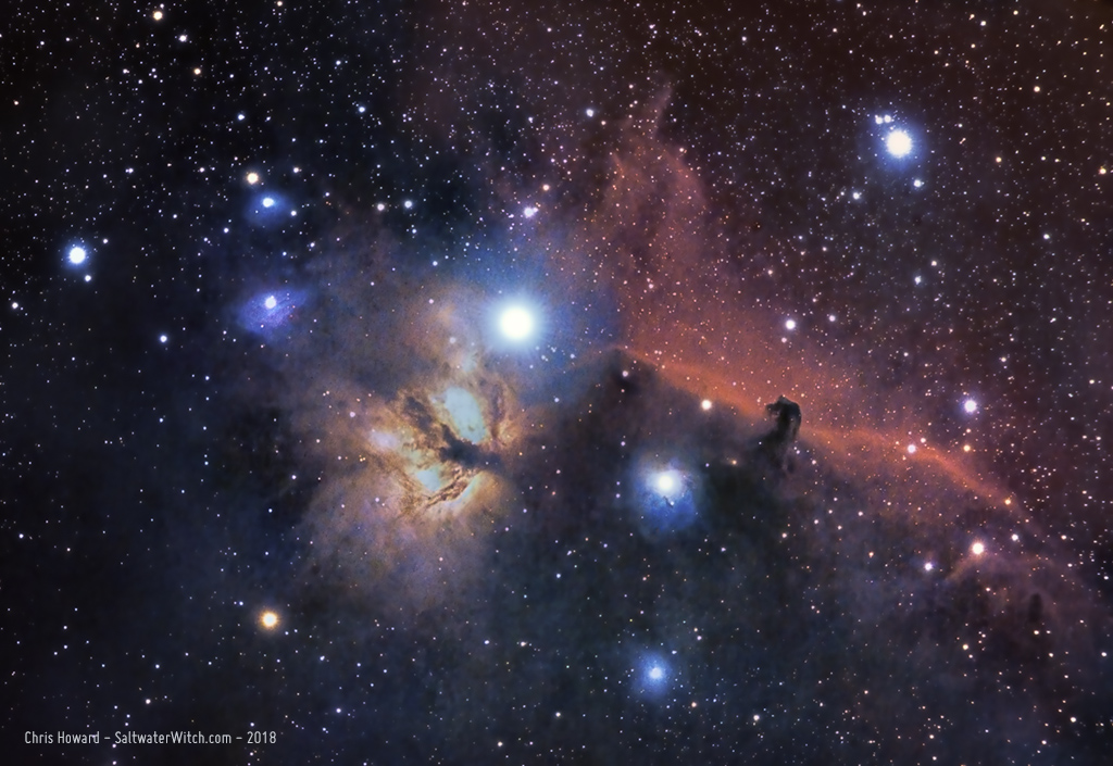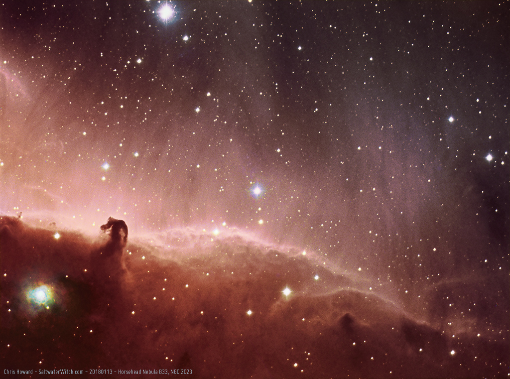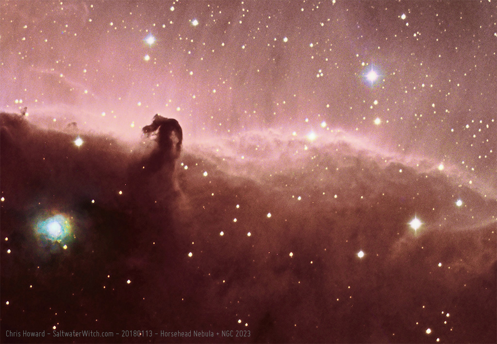 It's winter and that's when Orion is arguably the main attraction in northern hemisphere skies. HaRGB of the Horsehead Nebula (Barnard 33) along with the reflection nebula NGC 2023 (below and left), part of a whole neighborhood of nebulosity around the leftmost star in Orion's Belt, the blue supergiant Alnitak. (I kept Alnitak out of frame, but it would off to the left with a wider field of view). The Horsehead is an absorption (or dark) nebula about 1500 lightyears from Earth, and shows up so prominently because it's blocking most of the starlight behind it. (10 x 600 second Ha frames, 10 x 240 second RGB frames, 24 dark cal frames taken with an Atik414Ex mono CCD, William Optics GT-81 + 0.8x Field Flattener/Reducer f/4.7, iOptron CEM25P EQ mount, Astronomik 12nm Ha filter, Baader RGB filters, WO 50mm guide scope with ZWO ASI120S-MM guide cam, INDI/KStars/Ekos observatory control. Location: Stratham, New Hampshire, US. ~Bortle 4)