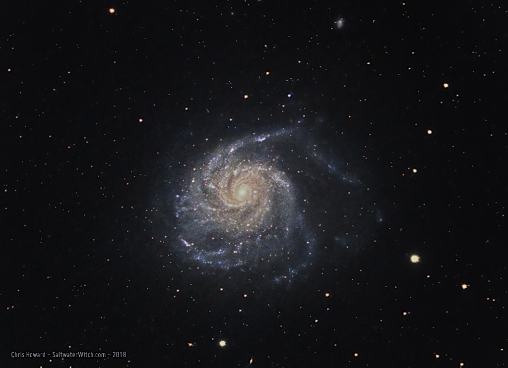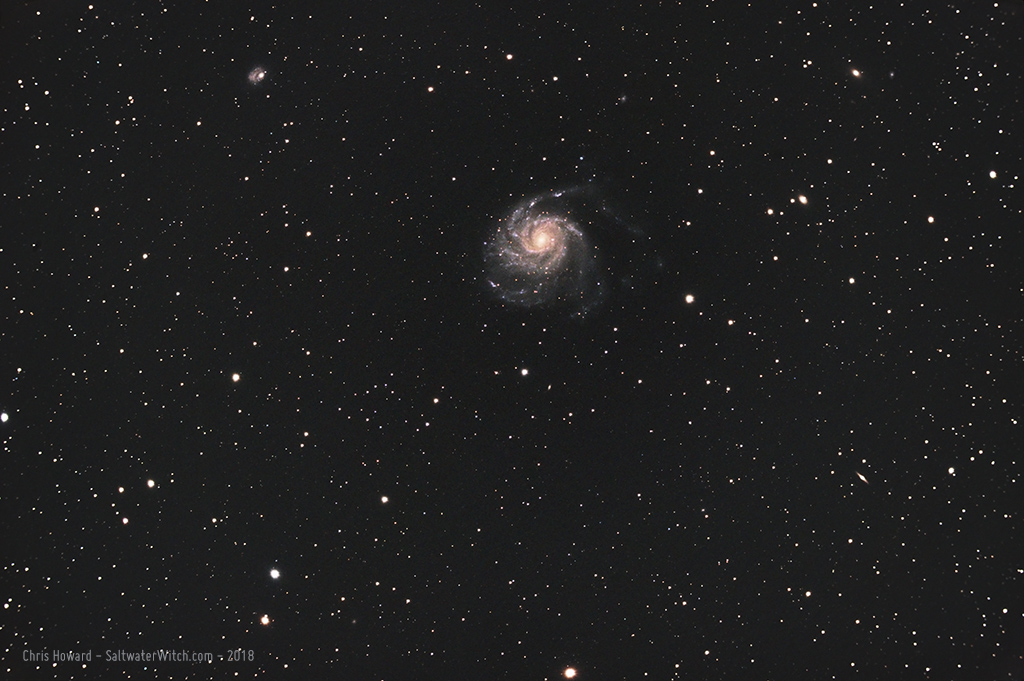 Pinwheel Galaxy, M101, a spiral galaxy about 21 million lightyears from earth in the constellation Ursa Major (Big Dipper). (Light frames: 10 x 120 secs, 4 x 600 secs, 12 x 300 secs). William Optics GT81 APO refractor, ZWO ASI071MC-C camera, iOptron CEM25P EQ mount, INDI/KStars/Ekos.