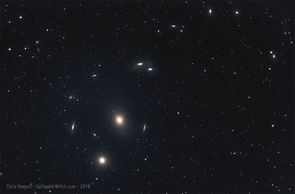 A whole string of galaxies millions of lightyears from earth. Markarian's Chain in the Virgo Cluster, including M84, M86, the Eyes Galaxies (NGC 4435 and NGC 4438) and a few more galaxies and galaxy pairs. The Eyes are 52 million lightyears away! 30 x 120 sec frames, 20 dark frames, stacked in DSS. William Optics GT81 APO refractor, ZWO ASI071MC-C camera, iOptron CEM25P EQ mount.