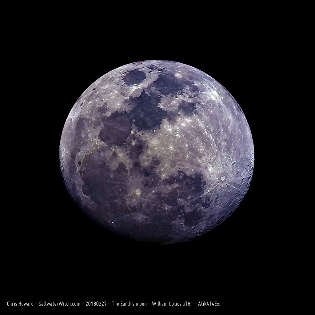 Our moon is looking especially beautiful tonight, even if it's making it difficult to do some deep space imaging. This is a single frame with the William Optics GT81 refractor and Atik 414EX CCD camera and a Celestron UHC/LPR filter that's been sitting in its box for a couple years--so I thought I'd give it a try. I also added a subtle RGB color layer from a few months back.