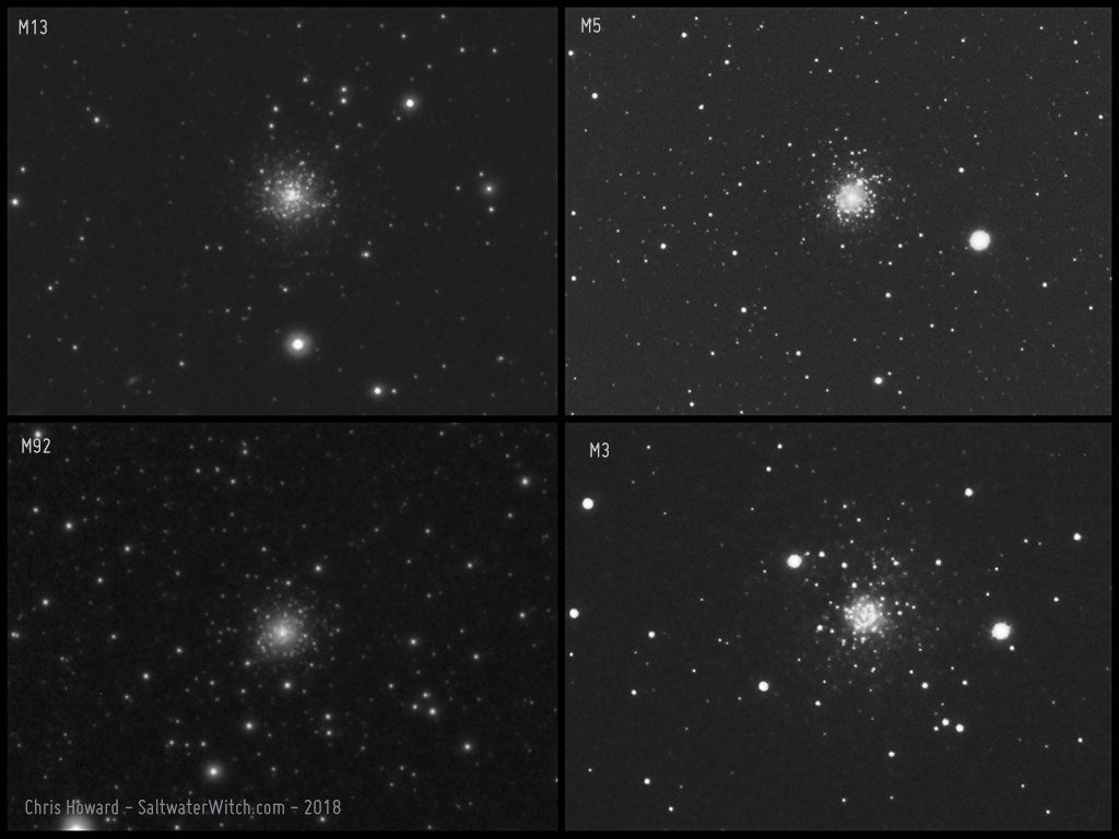 Although the skies were clear last night, the "seeing" wasn't great--"seeing" refers to the amount of atmospheric interference from temperature changes, convection currents, and other funny stuff going on in the air above your telescope. I did get to test out the Pentax 200mm f/4 lens with the Atik 414EX monochrome CCD, and an Ha longpass filter. These clusters are fairly small, so this isn't a very good setup for shooting them, but here you go anyway. Top left: the 300,000 stars that make up Messier 13 (NGC 6205), a globular cluster in the constellation Hercules. Messier 5 in the constellation Serpens. The M3 globular cluster the constellation Canes Venatici. Messier 92 (NGC 6341) is another cluster in the constellation Hercules.