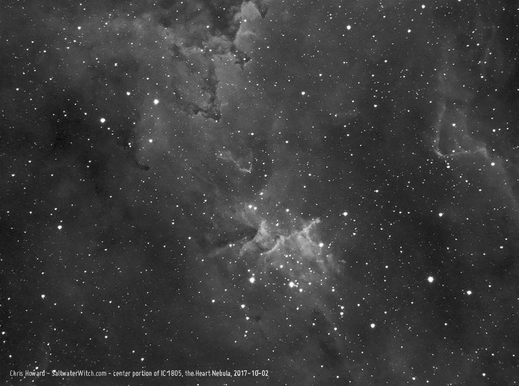 I love this early autumn weather! Here's a 20 minute hydrogen alpha exposure/sub of IC 1805, the Heart Nebula, a diffuse nebula in Cassiopeia. FoV: 1.05 × 0.79° (William Optics GT-81, Atik 414Ex CCD, ZWO ASI120MM guide camera with WO 50mm guide scope, Astronomik Ha 6nm filter).