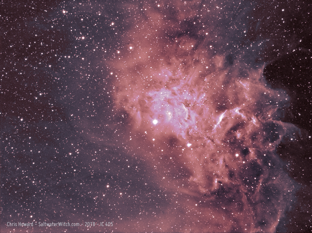 IC 405--"Flaming Star Nebula" in the constellation Auriga, centered on the mag. +6 star AE Aurigae. It's relatively close to us, at about 1,500 light-years. This set of subframes covers the center of the fairly large nebula, which measures 37 x 19 arcminutes. (6 x 1200 second subs in Ha, O3, S2, taken with my current main setup: Atik414Ex mono CCD, William Optics GT-81, CEM25P EQ mount, WO 50mm guidescope with ZWO ASI120S-MM guide cam, INDI/KStars/Ekos observatory control).