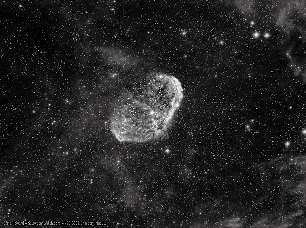 NGC 6888 - Crescent Nebula in Ha (4 x 1200 second subs + 15 dark frames stacked in DSS). I continued my hydrogen alpha campaign tonight, with a couple more targets, including the Crescent. My goal over the next month or two is to continue capturing these nebulae in O3 and S2, and use those results with these Ha shots to produce color images. I may also test out some Ha+RGB image processing on a couple of the brighter ones like IC 1369a, the Elephant Trunk Nebula.