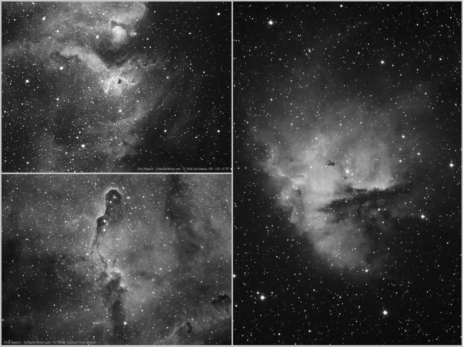 Astrophotography with a full moon! I switched to narrowband imaging a few days ago, which has the advantage of limiting the light to a very narrow range, and not really being affected by the light of the sun reflected off the big smiling face of our moon. The requirements are far stricter than color or LRGB imaging in terms of exposure times (10 - 30 minute exposures are typical), which in turn require far tighter alignment for the mount and guiding system. I have three narrowband filters--Ha (hydrogen alpha) OIII (oxygen) and SII (sulfur), all with 6nm bandpass. For these images below I'm only imaging with the Ha filter and the Atik 414EX monochrome CCD camera. Image info: top-left: IC 1848 Soul Nebula (the center portion), bottom-left: IC 1369a Elephant Trunk Nebula, right: NGC 281 Pacman Nebula. 4 x 20 minute (1200 second) subs stacked in DSS.
