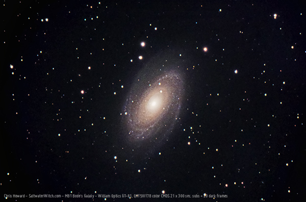 Color version of M81 (Bode's Galaxy) in the constellation Ursa Major (Big Dipper). From another set of subs I shot at 4am--this time with the color QHY CMOS camera, QHY5III178. Info: 21 x 300 sec. with 20 dark frames, QHY5III178 color CMOS, William Optics GT-81, CEM25P EQ mount, WO 50mm guidescope with ZWO ASI120S-MM guide cam, INDI/KStars/Ekos observatory control.
