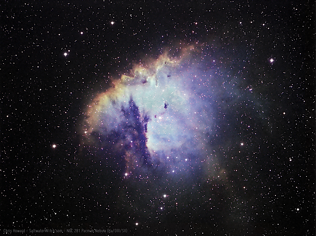 NGC 281 (IC 11, Sh2-184) "Pacman Nebula" in the constellation Cassiopeia. More narrowband imaging, although the moon is waning, and didn't even make into the sky until the early morning hours. I completed the subs for NGC 281 by 1am, and scheduled some narrowband exposures of IC 405, Flaming Star Nebula. (subframe info: 6 x 1200 second exposures in Ha, 5 x 1200 sec OIII & SII with 16 dark frames, Atik414Ex mono CCD, Astronomik 6nm Ha, OIII, SII, William Optics GT-81, CEM25P EQ mount, WO 50mm guidescope with ZWO ASI120S-MM guide cam, INDI/KStars/Ekos observatory control).