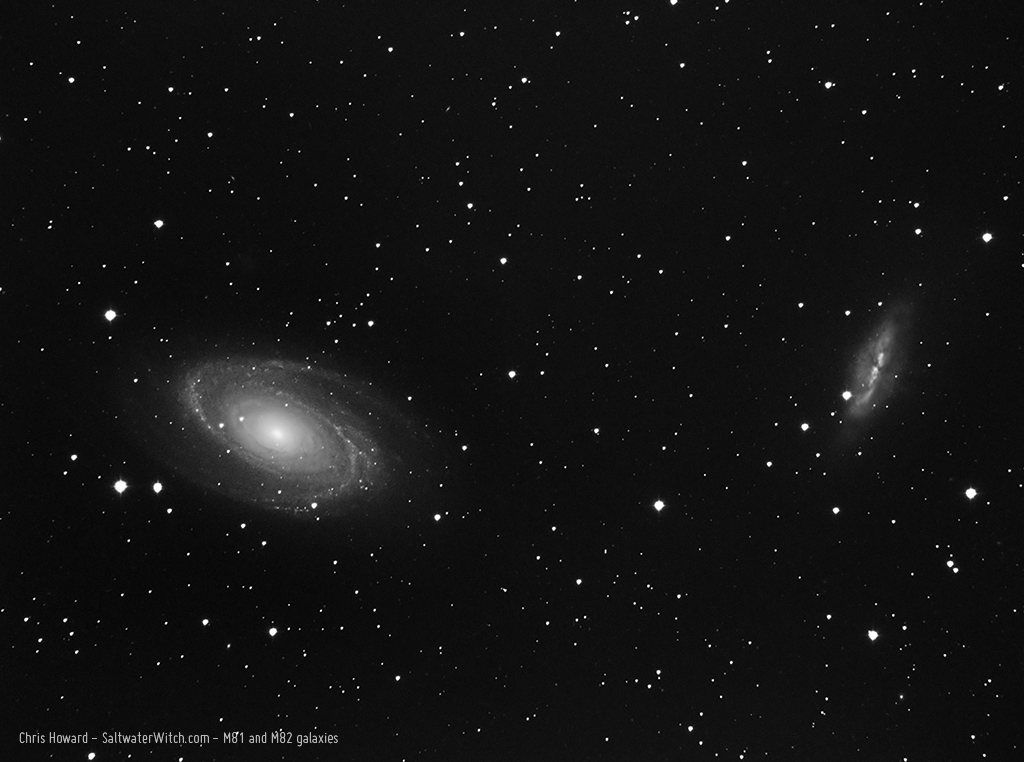 M81 (Bode's Galaxy) and M82 (Cigar Galaxy) in the constellation Ursa Major (Big Dipper). I was up at 4am, and there's the big dipper swinging around and climbing into the sky. Bode's and the cigar galaxy were just waiting to be captured. Info: 15 x 120 sec. with 10 dark frames, Atik414Ex mono CCD, William Optics GT-81, CEM25P EQ mount, WO 50mm guidescope with ZWO ASI120S-MM guide cam, INDI/KStars/Ekos observatory control.