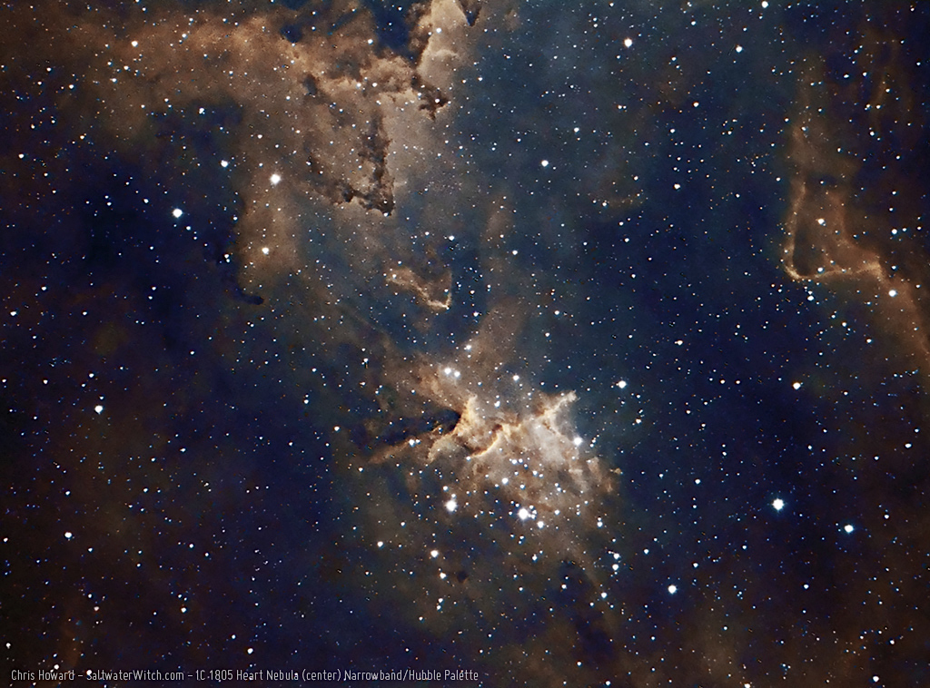 I finally made some time to process one of the image sets I shot on October 2, and here's one result: narrowband of the central region of the emission nebula IC 1805, the Heart Nebula, which is only 7500 lightyears away in the constellation Cassiopeia. (It's almost in our backyard!) I used the "Hubble Palette", mapping the separate hydrogen alpha, oxygen, and sulfur image channels to RGB channels (SII = Red, Ha = Green, OIII = Blue) in the final. (subframe info: 4 x 1200 second Ha, 4 x 600 sec OIII & SII with 2x2 binning, Atik414Ex mono CCD, William Optics GT-81). I'm not entirely happy with this one, but good enough to post.
