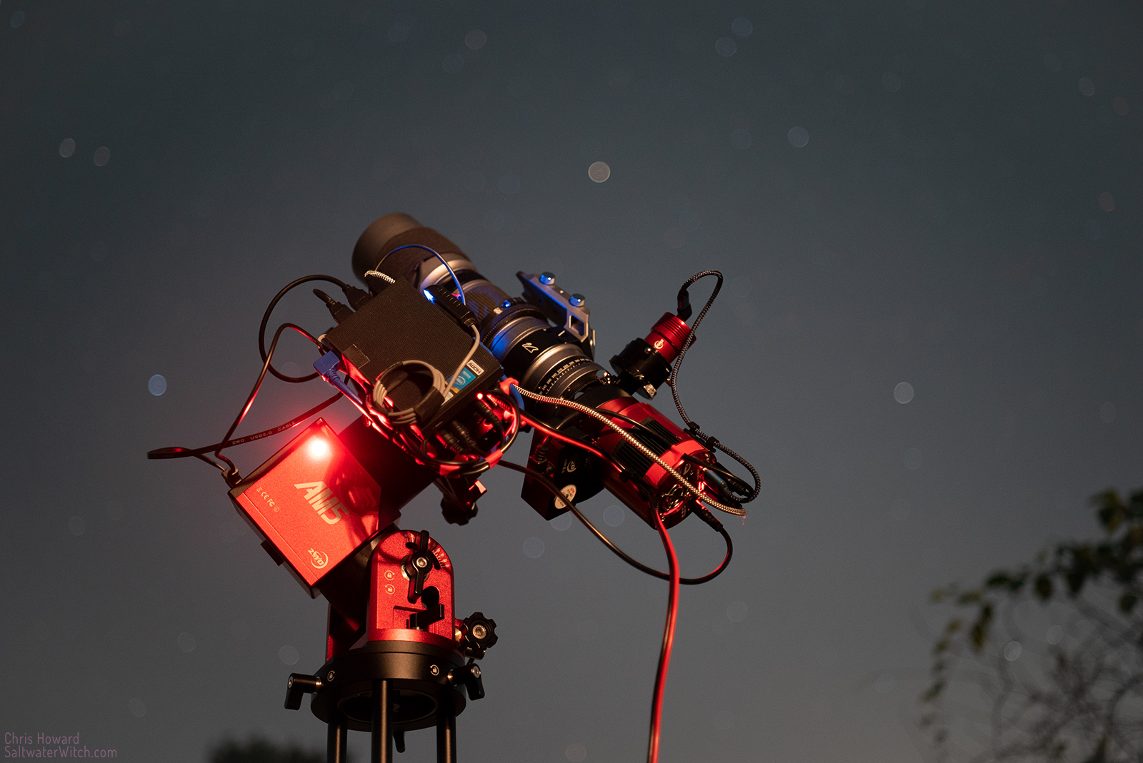 Last night was also my first night out with the ZWO ASIAir Plus (astro device controller), and because the Wizard has all three bands present to some degree, hydrogen-alpha, oxygen 3, and sulfur 2, I thought I would try something new: shooting 10 subs for each filter, running autofocus for each set, and then looping through each set of three filters three times. This way I would end up with 30 sub frames for each over the course of one night, a reasonable amount of data. This would also allow me to see how the meridian flip went, how well the autofocus routines work, and more. Note: with the 3nm Antlia Pro narrowband filters, each autofocus run takes about 7 minutes, with a set of 20 second exposures—the routine needs at least 20 just get enough stars to focus with these very narrow 3 nanometer filters.