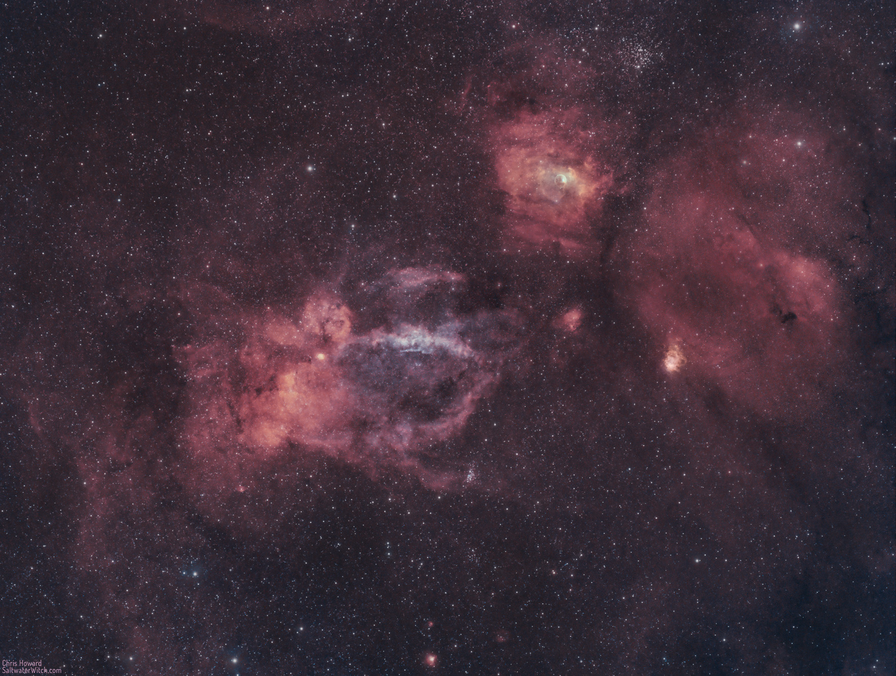 I finished up the Lobster Claw Sunday night with some 3 nanometer Oxygen3 data. The Lobster Claw (Sh2-157), the Bubble Nebula, and so much more, extending over the border from Cassiopeia into Cepheus. The squarish bright region, Sh2-157a, at the joint of the top bluish arc of the Claw is a denser emission structure surrounding the Wolf Rayet star WR-157. The Bubble Nebula is middle top (NGC 7635, Sharpless 162, Caldwell 11), and the bright emission region below and to the right is NGC 7538. That cluster of stars above the Bubble Nebula is Messier 52 (M52). The Lobster Claw Sh2-157 is about 8000 lightyears away.