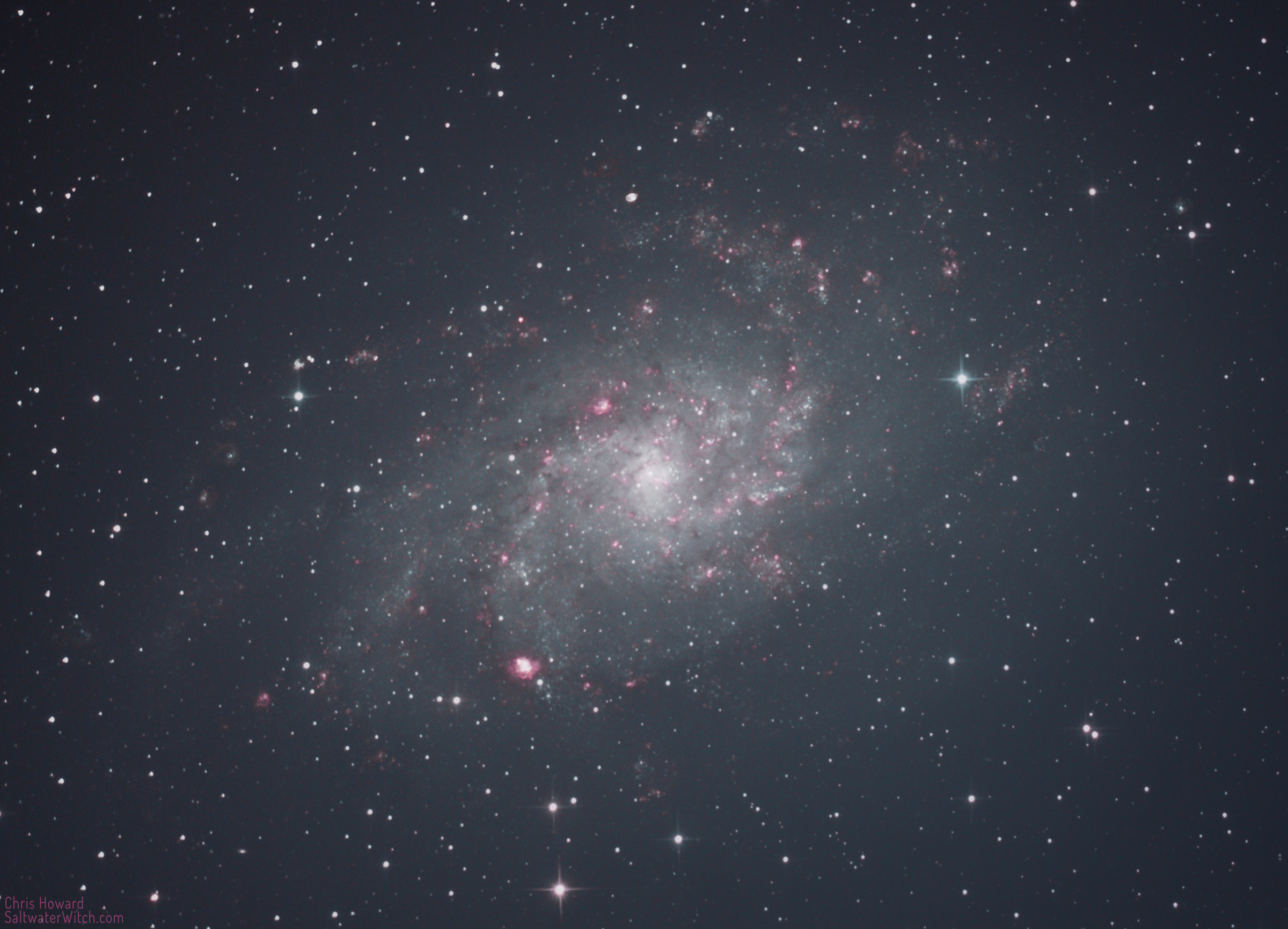 The Triangulum Galaxy from my backyard--it's only 2.73 million light-years from Earth! I've said it before. Once we develop MFTL technology (Much Faster Than Light) and we have the ability to hop to nearby galaxies, count me in on a trip to M33, the Triangulum Galaxy. The chunky pinkish masses are vast regions of interstellar ionized hydrogen that make up the nebulae in M33, perfect for an astrophotography outing. Until then, maybe we can take a trip to the southern hemisphere? Notes: Apertura 8" Newtonian OTA--800mm at f/4, ZWO ASI071MC cooled color camera. Optolong L-eXtreme dual narrowband filter. 48 x 240-second exposures stacked in DSS.