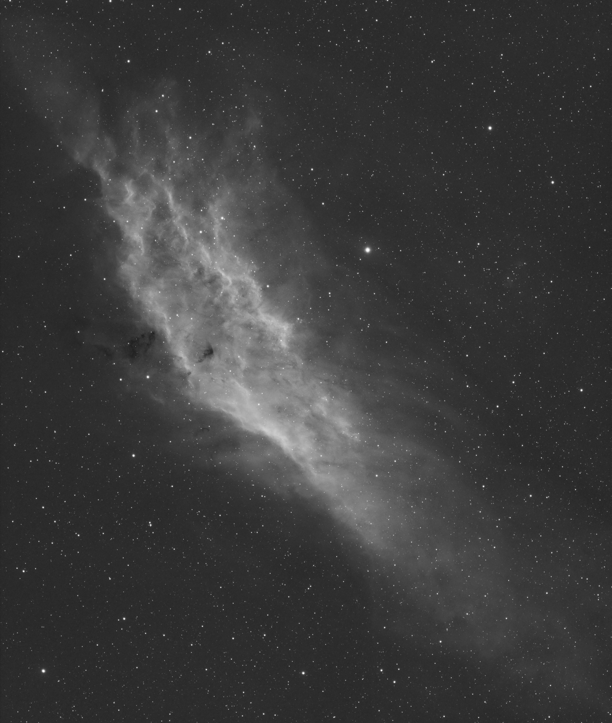 The California Nebula (NGC 1499) in the constellation Perseus. Imaging notes: 3nm Antlia Pro hydrogen-alpha filter, William Optics SpaceCat 51 Apochromatic refractor, ZWO ASI1600MM-Pro monochrome camera.