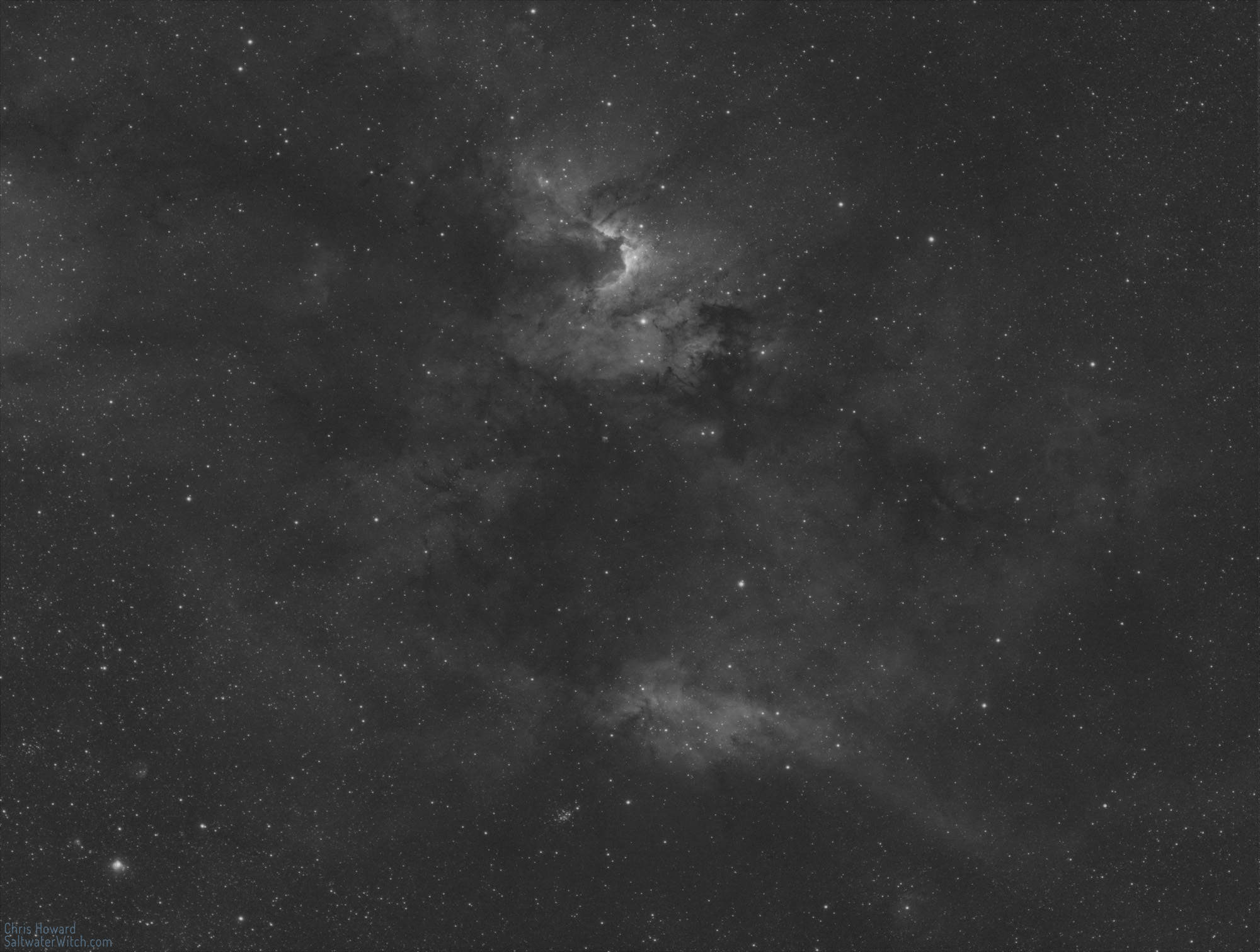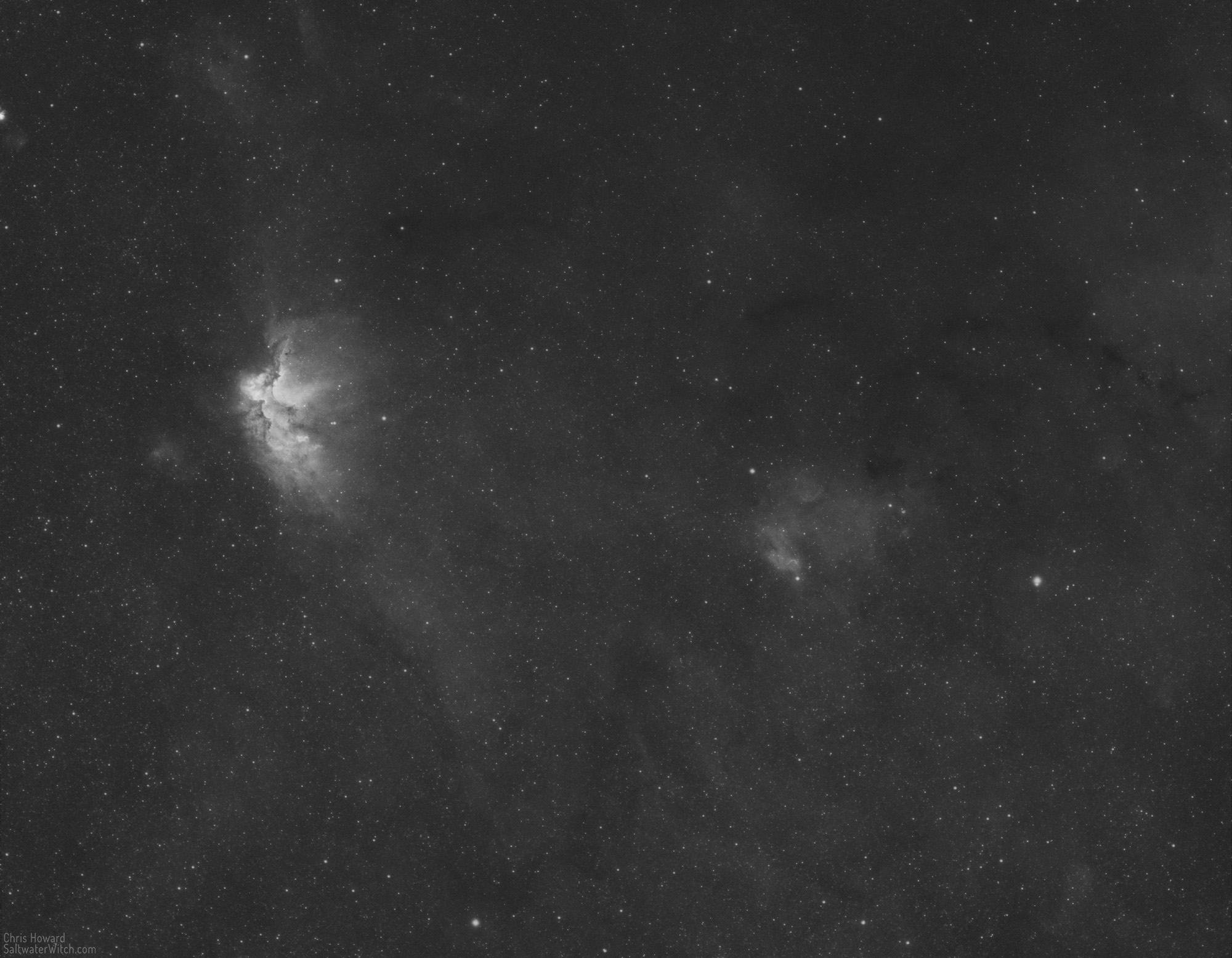 The Cave Nebula (Caldwell 9) in Cepheus. I started the Ha run last night but Earth's atmosphere wasn't having any of it. Seeing was poor at best, and the random wisps of cloud passing through just made it worse. I stacked the first 30 subs just to see where it was going, and even with the excessive noise, I think this is headed in the right direction.