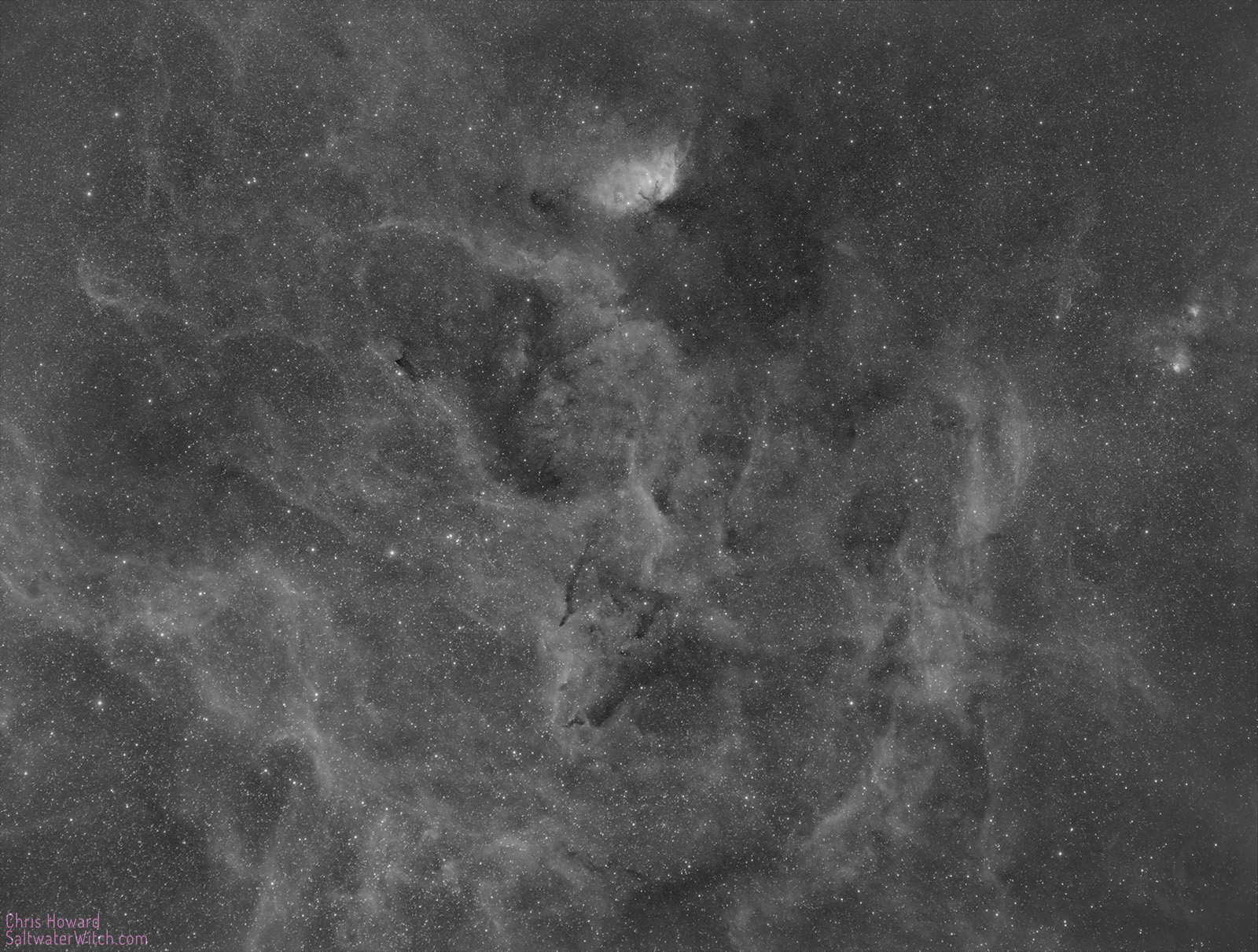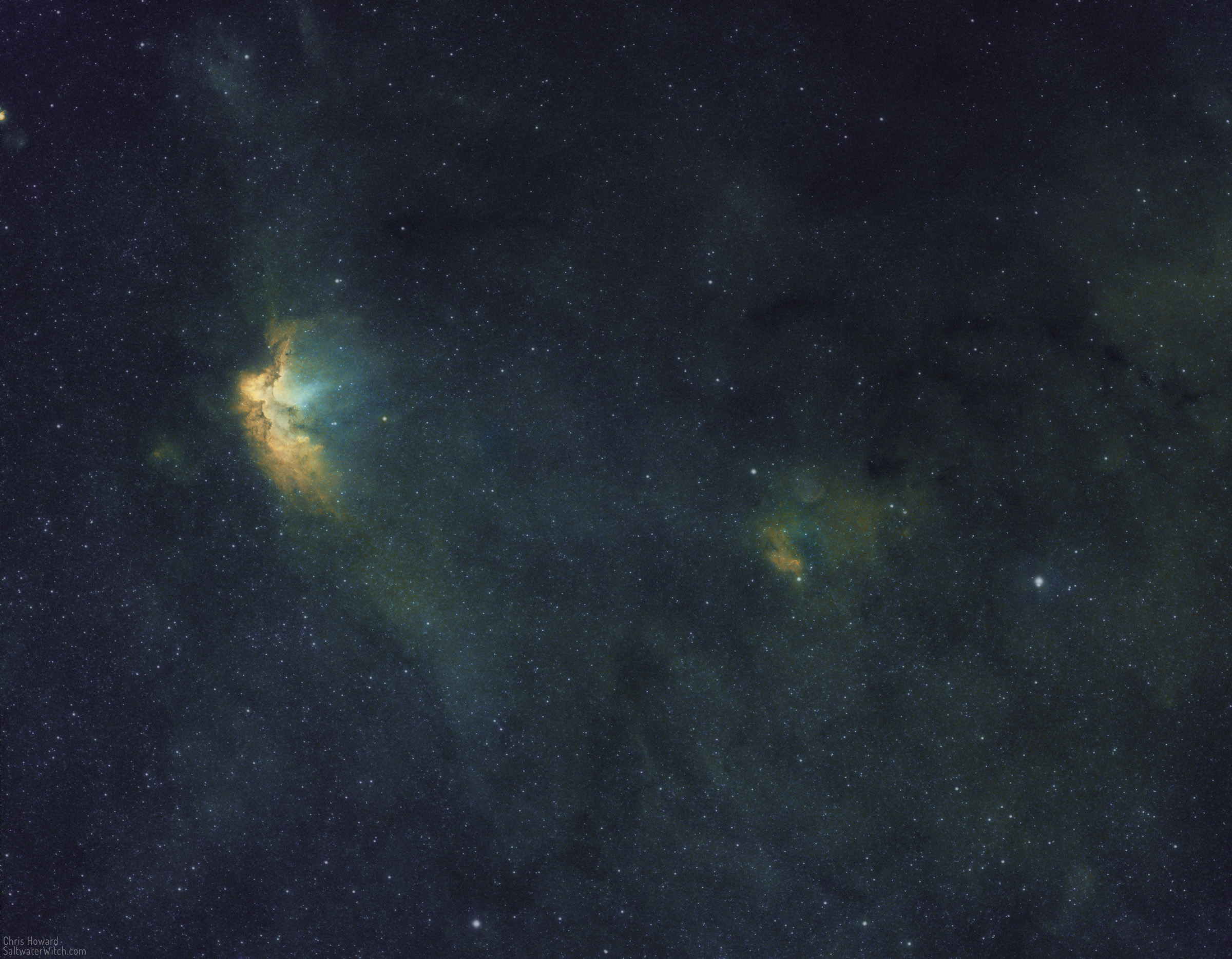 NGC 7380 is an open star cluster in Cepheus, surrounded by the bright emission nebula Sharpless 142 (Sh2-142, center, left), but we all know it as the Wizard Nebula. Why? Well, because it sort of looks like a bent old dude with a pointy hat looking out over a vast expanse of nebulosity, loops of dark interstellar dust, and a spread of hot stars bathing everything in intense radiation, all of which could be mistaken for some sort of magical display. In other words, what a wizard might do. That's my guess, anyway.
